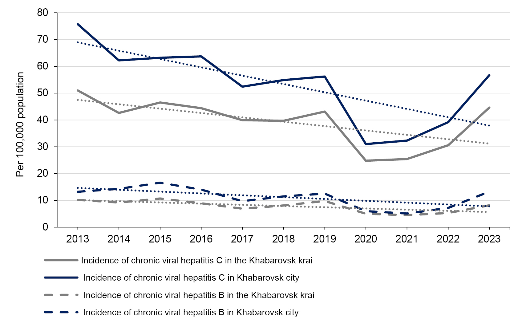 The decline in chronic viral hepatitis incidence after 2019 coincided with the start of the COVID-19 pandemic, during which restrictive measures were introduced to reduce the spread of SARS-CoV-2 among the population. In 2022 and 2023, when the restrictions were gradually lifted, an increase in chronic hepatitis C incidence of 20.5 and 45.7% in the Khabarovsk Krai and 21.4 and 44.6% in Khabarovsk, respectively, began to be recorded. The incidence of chronic hepatitis B in the Khabarovsk Krai and Khabarovsk increased by 17.8 and 41.2% in 2022, respectively, and by 54.7 and 84.7% in 2023, which is probably due to an increase in the number of patient visits to medical organizations, including laboratory testing that reached levels of 2019.
