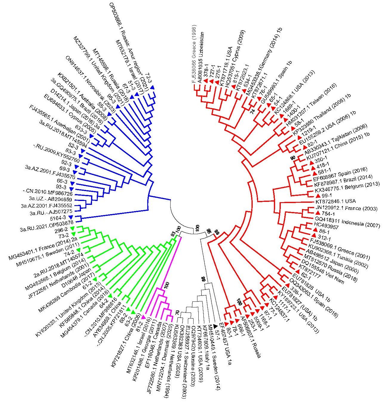 Phylogenetic tree was constructed using the neighbor-joining method. HCV sequences evaluated in current work are marked with triangles. HCV reference sequences are specified by their GenBank accession numbers. Bootstrap index values exceeding 70% are indicated. Blue lines — subtype 3a; red lines — subtype 1b; green lines — subtype 2a; black lines — subtype 1a; violet lines — subtype 2c.