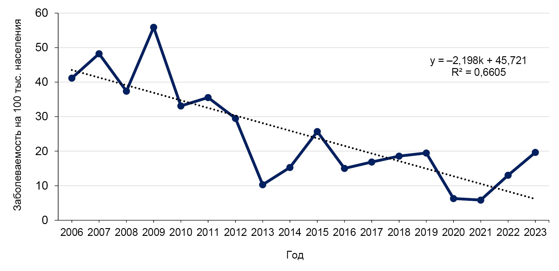 В 2006–2023 гг. эпидемический процесс в Кировской области характеризовался тенденцией к снижению заболеваемости ИКБ (рис. 1). Так, наблюдается снижение заболеваемости ИКБ в Кировской области — ежегодно в среднем на 2,2 на 100 тыс. населения (R2 = 0,660).