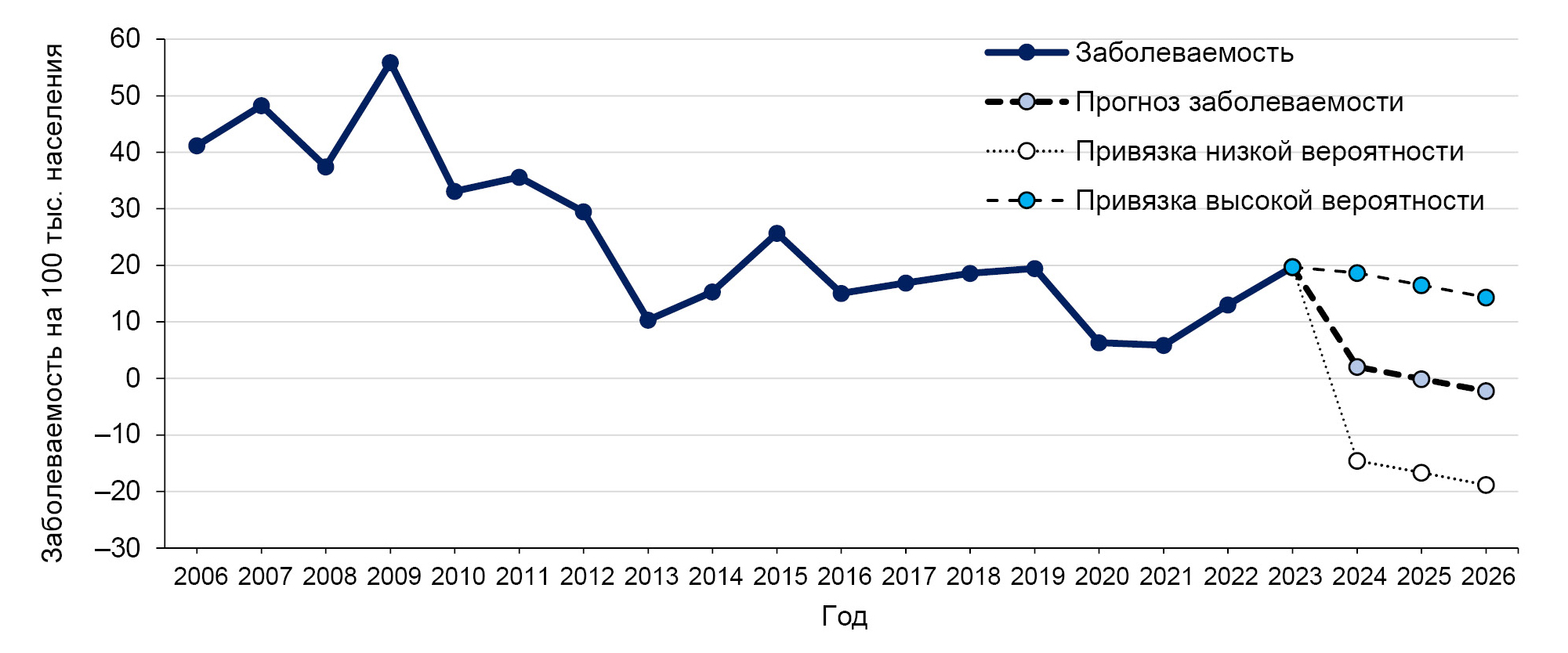 Интервальный прогноз заболеваемости ИКБ в Кировской области на период с 2024 по 2026 г. демонстрирует тенденцию к снижению. Наблюдаемое уменьшение интенсивности проявлений эпидемического процесса может объясняться увеличением объёма акарицидных работ, изменением погодных условий (тенденция к снижению среднегодового объёма осадков). Следует отметить, что нельзя исключить влияние других факторов.