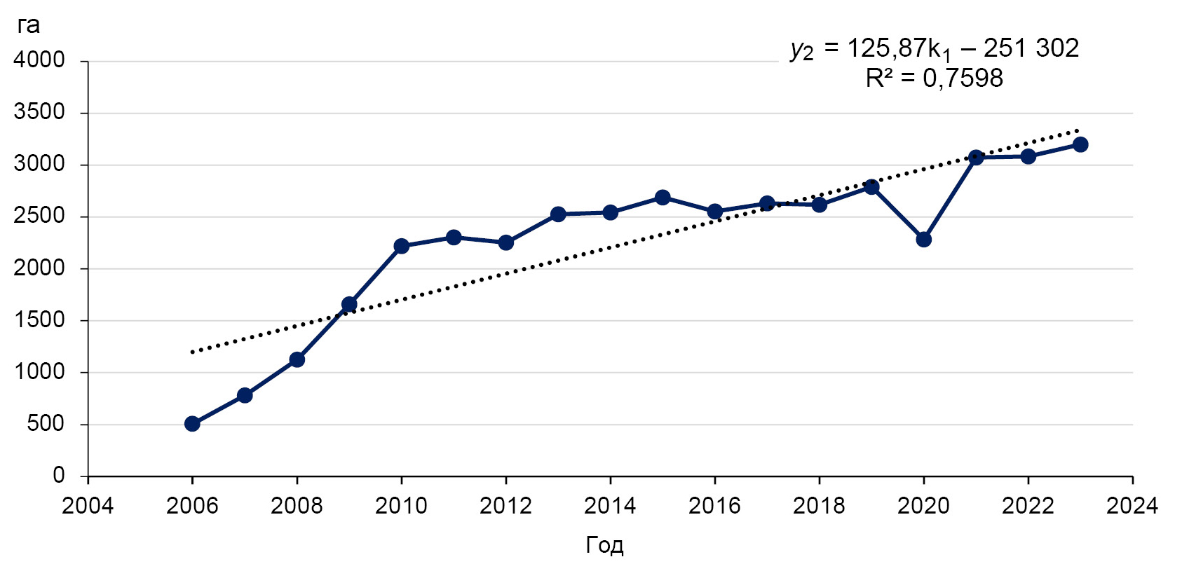 Рис. 3. Объём акарицидных работ в Кировской области в 2006–2023 гг.