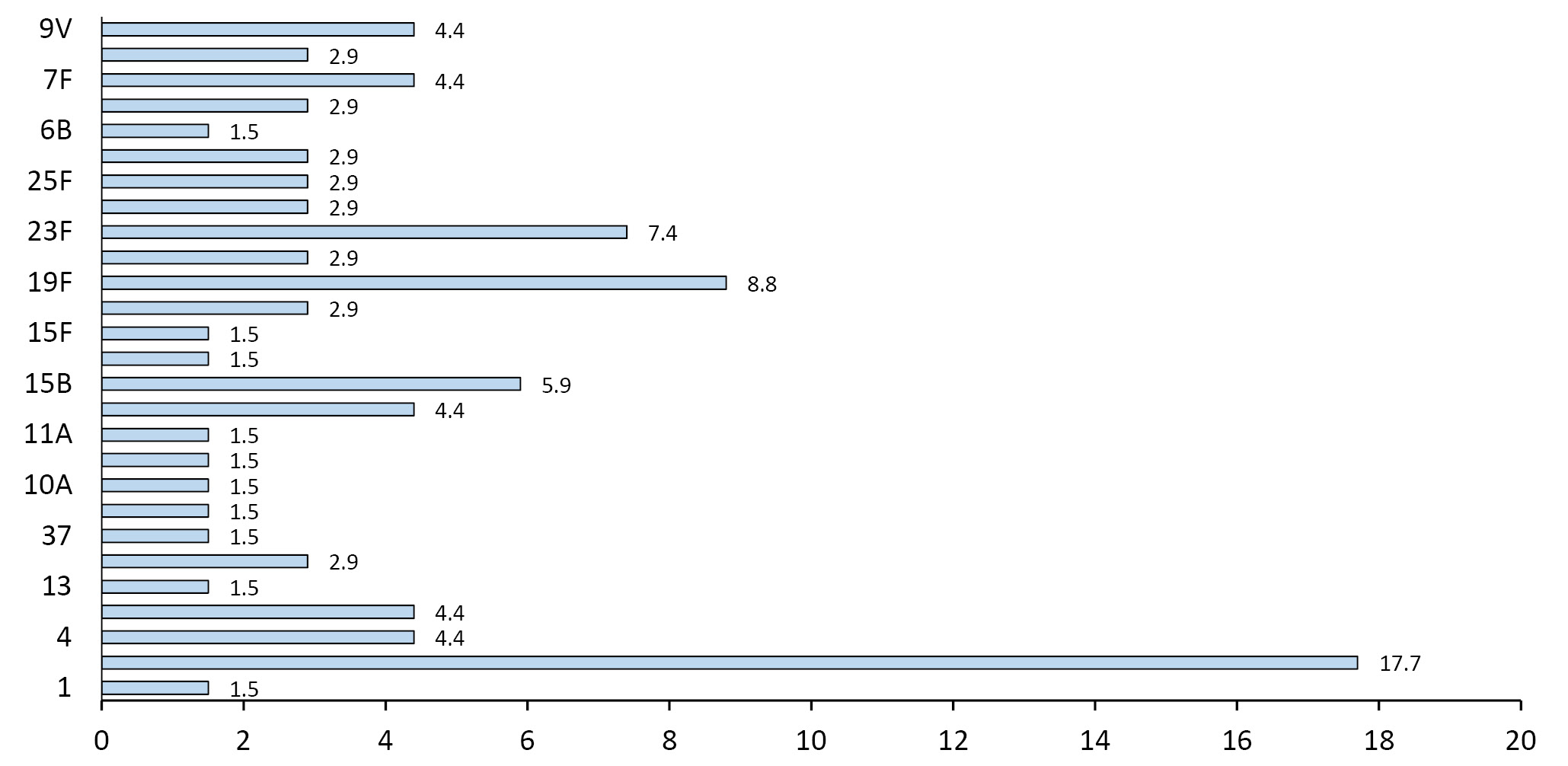 Analysis of whole genomic data showed that serotypes included in pneumococcal polysaccharide 23-valent vaccine (PPV-23) and pneumococcal conjugate vaccine 13 (PCV-13) were predominant among invasive isolates — 3 (18%), 19F (9%), 23F (7%) and 15B (6%). The coverage rate of PPV-23 was 79% and PCV-13 was 59%. Frequency of isolation of pneumococci of non-vaccine serotypes in meningitis in Russia: 28A and 35F — 3% each, 13, 37, 38, 10C, 15C and 15F — more than 1% (Figure).
