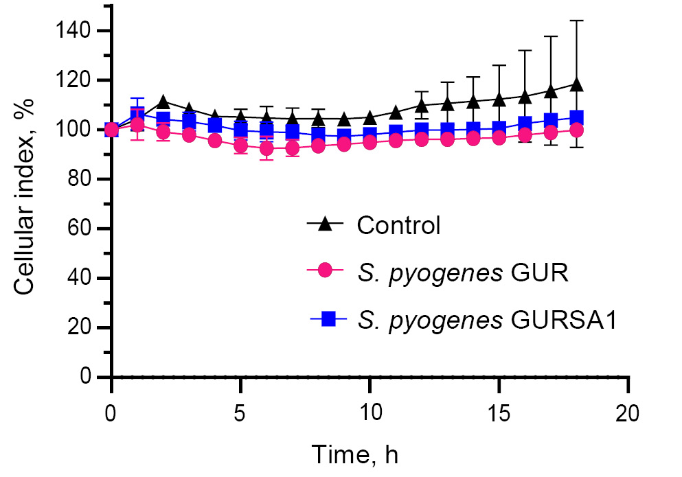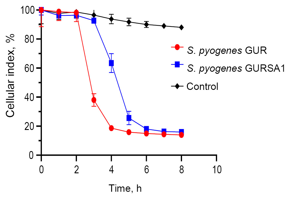 Fig. 3. Effect of S. pyogenes strains GUR, GURSA1 on C6 cells in real time using xCELLigence system [23].