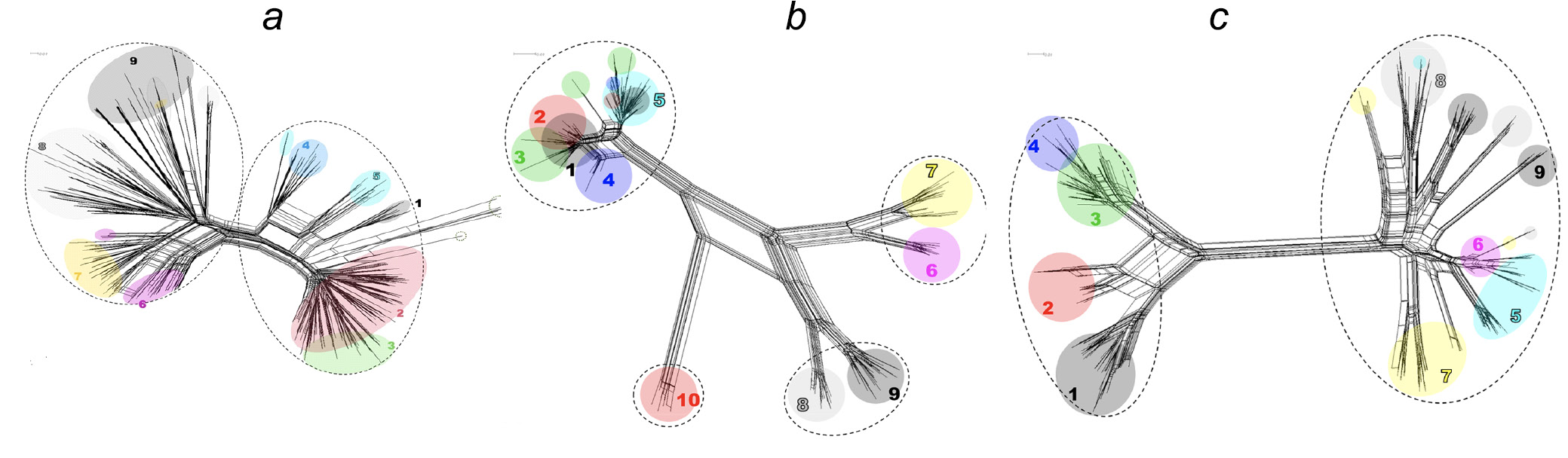 a — M protein; b — Mrp (221 sequences); c — Enn proteins (262 sequences). Black dotted ellipses denote two groups of M proteins, green dotted ellipses denote chimeric M proteins, and colored ellipses denote subgroups of M proteins.
