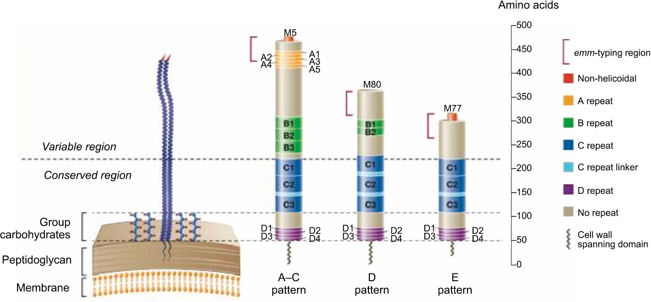 The length of the M protein and the size of the repeat and non-repeat domains are shown to the scale. The A–C emm patterns are the longest M proteins with a hypervariable domain of 230 amino acids. The D and E structured M proteins have hypervariable domains consist from 150 and 100 residues, respectively. The “A” repeats are absent from the vast majority of M proteins belonging to the D and E pattern groups. The “B” repeats are present in most A–C and D M proteins, but are absent from the E–M subtypes of M proteins