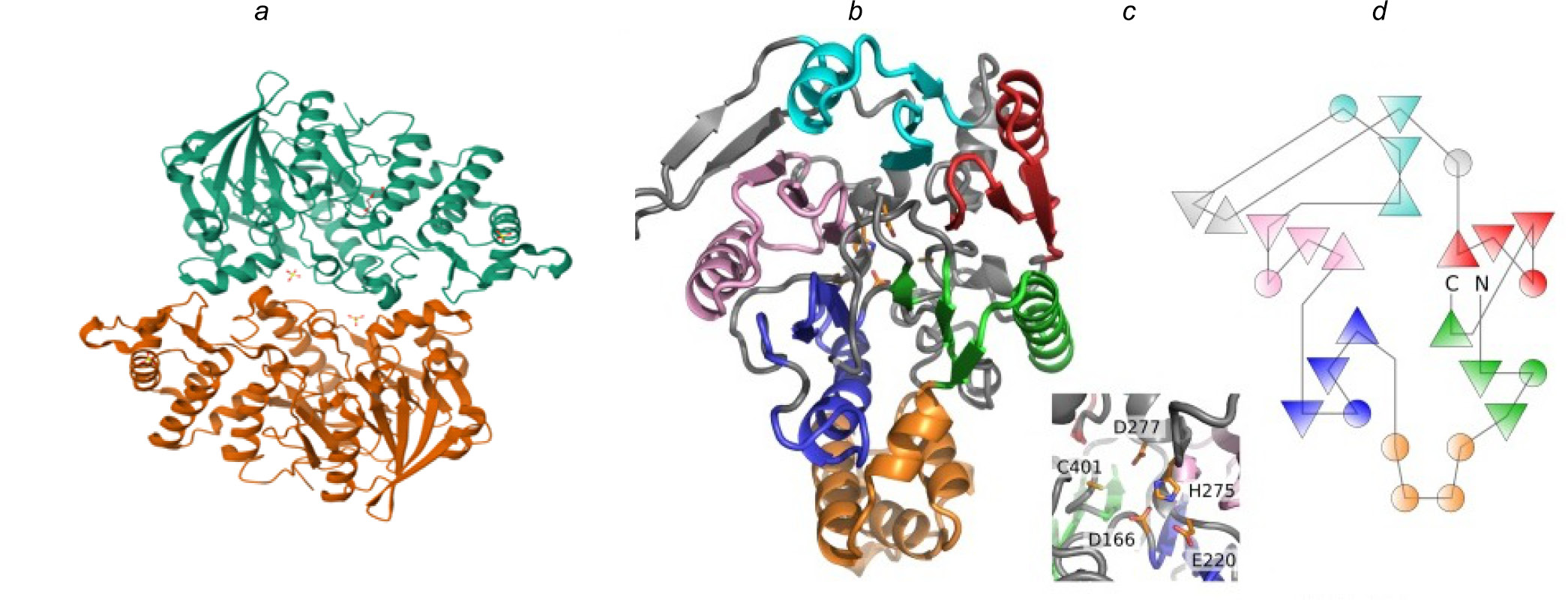 Fig. 8. Structure of arginine deaminase from S. pyogenes (a); crystal structure illustrating the connecting regions (b): green, blue, pink, light blue and red colors, respectively; residues of the ADI active site (c), and the ADI topological diagram (d) [28].
