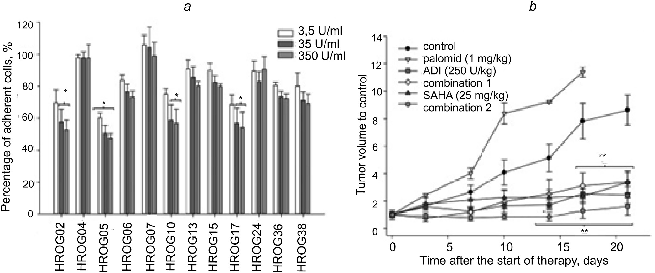ADI was first isolated from the Su strain (3 μg/mL), which is capable of inhibiting the growth of transformed BALB/3T3 fibroblast cells [29]. ADI is localized in the cell wall of S. pyogenes, whereas in S. suis the same enzyme is present in the membrane fraction of cells. Its activity is associated with the ability to convert arginine to ammonia and citrulline [30]. On the other hand, arginine utilization enhances the proliferation and growth of some types of tumors such as melanoma, hepatocellular carcinoma and prostate cancer. Since arginine deficiency induces cycle arrest in G1-phase cancer cells, activation of mTOR- and GCN2-kinase genes in them, which trigger autophagy and apoptosis [31, 32], T. Fiedler et al. studied the efficacy of ADI therapy (3.5–350.0 IU/mL) and its combinations with cytostatic drugs: chloroquine (5 and 20 μM), hydroxamic acid suberoylanilide (SAHA; 0.25 and 0.5 μM) or palomide 529 (dual TORC1/TORC2 inhibitor; 7.5 μM) to inhibit the growth of 12 glioblastoma (GBM) cell lines in vitro and in vivo on male NMRI Foxn1nu mice weighing 20–25 g [33]. ADI administration inhibited GBM growth in 50% of tested lines (Fig. 9).