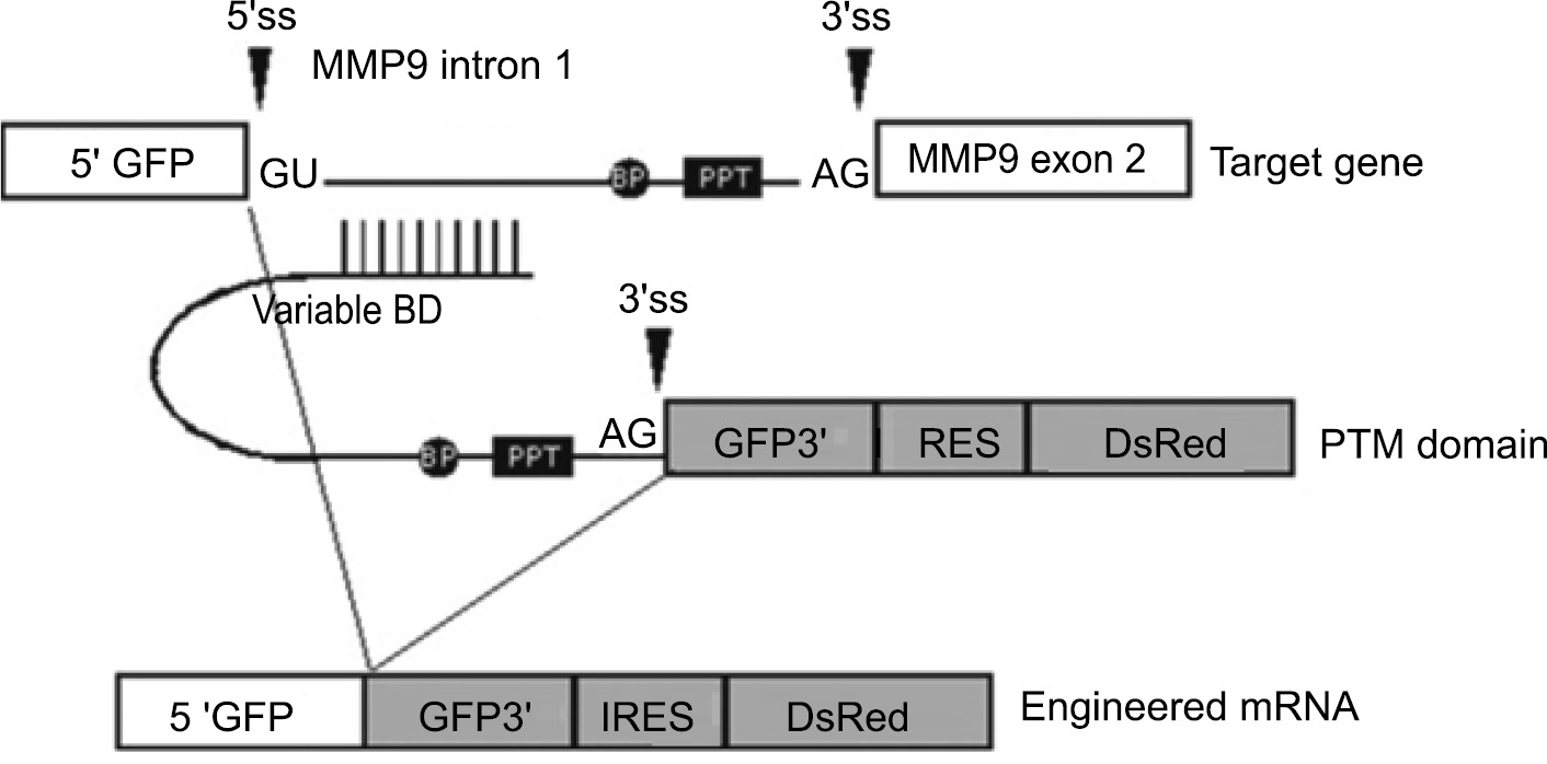 PTM is the engineered mRNA linked via an antisense BD domain to MMP9 intron 1. BP is the branch point; PPT is the polypyrimidine sequence.