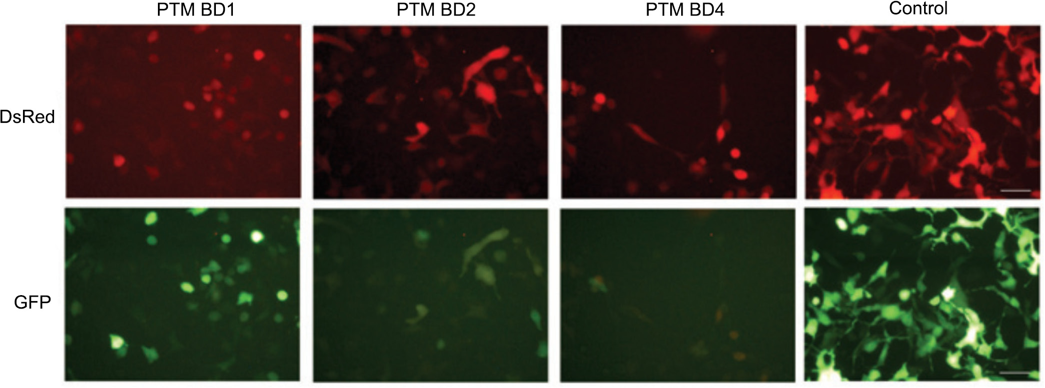 Control was transfected with a construct containing DsRed dye and full-length cDNA of GFP. Cells expressing GFP indicate trans-splicing in the target gene and the PTM carrying one of the three BD domains (BD1, BD2, and BD4). Scale bar is 20 mm.