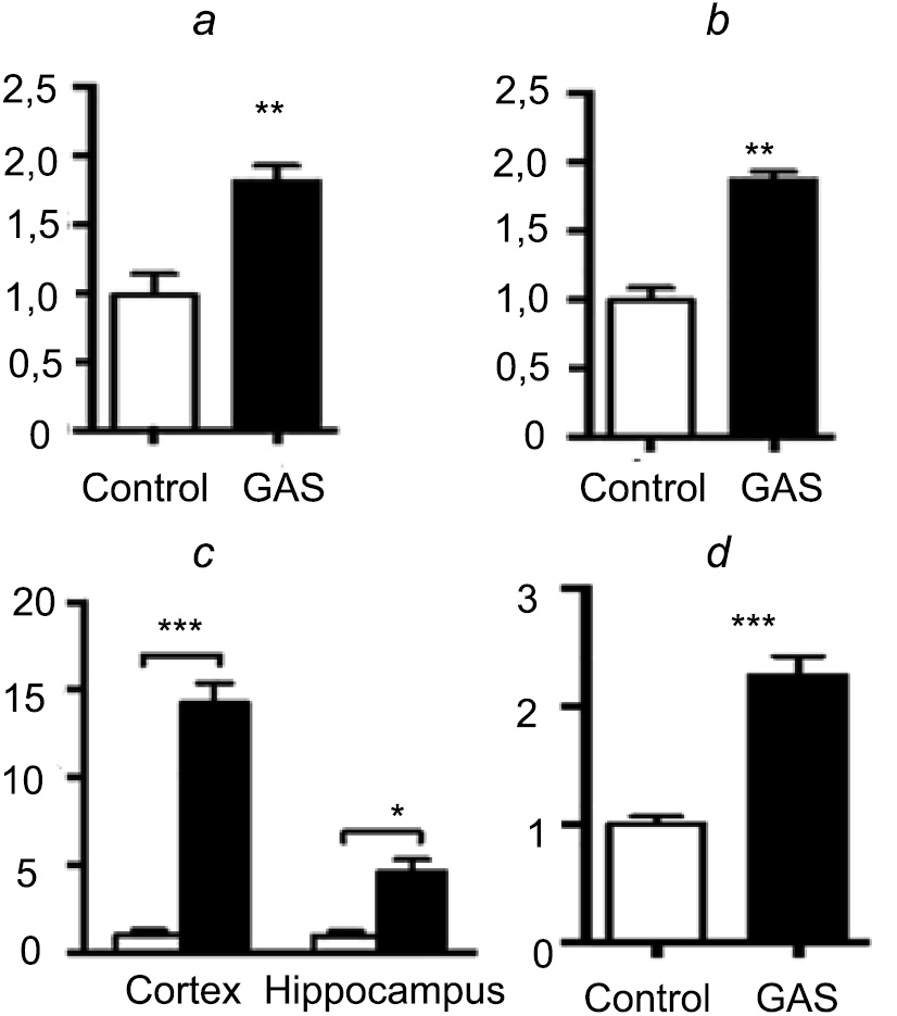 Fig. 14. Changes in GFAP (a), iNOS (b), MPO (c) and MMP-9 (d) levels in the brain during infection with S. pyogenes strain A20 in a patient [39].