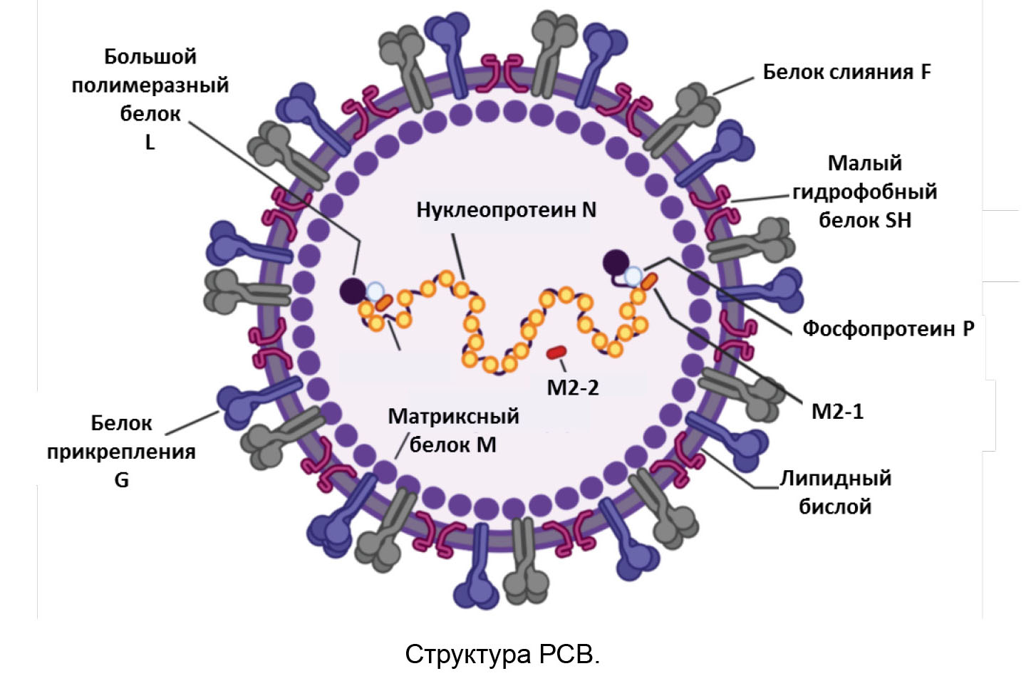 Геном РСВ несегментирован, с отрицательной полярностью размером 15,2 т. н., кодирует 11 вирусных белков. Вирусная оболочка РСВ содержит 3 трансмембранных гликопротеина: белок прикрепления G, белок слияния F и малый гидрофобный белок SH. С внутренней стороны вирусной оболочки расположен матриксный белок M. Вирусная РНК инкапсулирована нуклеопротеином (N) и большим белком (L). Фосфопротеины P и M2-1 опосредуют транскрипцию вирусной РНК. M2-2 регулирует синтез вирусной РНК. Рисунок адаптирован из [16].