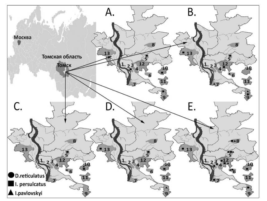 A — места выявления РНК ВКЭ; B — ДНК B. burgdorferi s.l.; C — ДНК B. miyamotoi; D — ДНК A. phagocytophilum; E — ДНК Rickettsia spp.