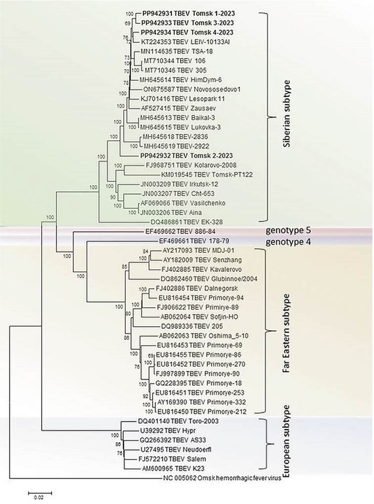 Прототипные штаммы | Tomsk 1-2023 (PP942931) | Tomsk 2-2023 (PP942932) | Tomsk 3-2023 (PP942933) | Tomsk 4-2023 (PP942934) | ||||