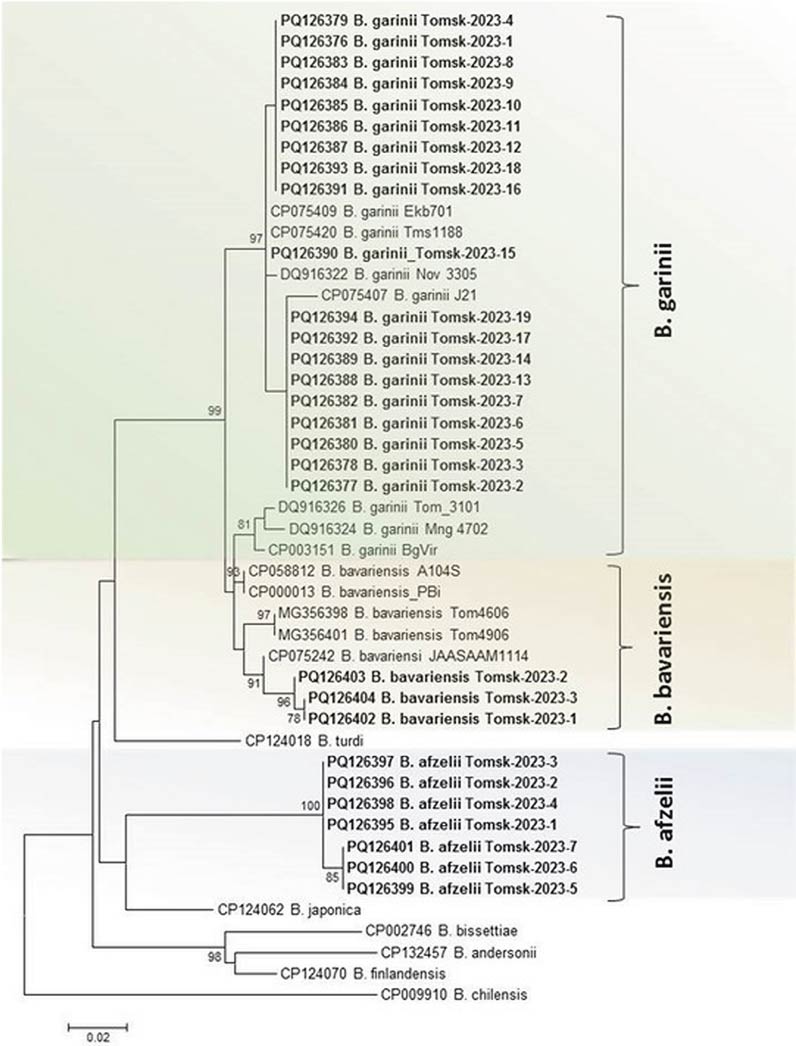Инфицированность клещей рода Ixodes B. burgdorferi комплекса s.l. составила 8,5%, что ниже средних значений последних лет [1–2, 6, 22–23]. Наиболее часто выявлялись B. garinii (65,5% случаев), реже определялись B. afzelii (24,1%) и B. bavariensis (10,4%). Популяция боррелий — возбудителей ИКБ гетерогенна, насчитывает более 20 видов боррелий, а на видовое разнообразие боррелий существенное влияние оказывает разнообразие резервуарных хозяев, которые обеспечивают циркуляцию и сохранение возбудителей ИКБ. С мелкими мышевидными грызунами обычно ассоциируются B. afzelii и B. bavariensis, с птицами — B. garinii [23]. Вполне вероятно, что доминирование B. garinii можно связать с тем, что в городских условиях важным прокормителем иксодовых клещей могут быть птицы [1, 8, 13, 24]. В иксодовых клещах рода Dermacentor ДНК B. burgdorferi s.l. нам не удалось обнаружить, но возможность наличия боррелий в клещах D. reticulatus подтверждается рядом публикаций [23, 24]. Филогенетический анализ секвенированных фрагментов ДНК боррелий показал, что изоляты боррелий формировали компактные монофилетические группы в пределах своего вида. Причём изоляты B. garinii группировались в 3 различные филогенетических ветви. При этом одна из этих групп, включающая в себя 9 изолятов, не ассоциировалась с изолятами, ранее найденными в Томске. Вероятно, можно говорить о появлении новых генетических вариантов B. garinii в городских биотопах Томска. В равной степени это предположение распространяется на изоляты B. afzelii и B. bavariensis, которые также формируют новые филогенетические группы.