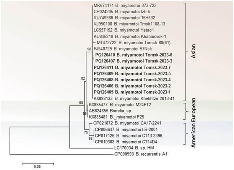 ДНК B. miyamotoi была обнаружена в 2,1% исследованных клещей рода Ixodes. Данный вид боррелий относится к возбудителям клещевых возвратных лихорадок, которые широко распространены в различных регионах мира, включая Россию [25–28]. С данным видом боррелий ассоциируются безэритемные формы ИКБ, при этом возбудитель способен вызывать тяжёлые формы заболевания, включая менингоэнцефалит, у людей с ослабленным иммунитетом, и микст-инфекции с другими возбудителями клещевых патогенов. Инфицированность иксодовых клещей B. miyamotoi обычно значительно ниже, чем боррелиями других видов и колеблется в пределах от 0,3–16% [27, 28]. В 2023 г. в иксодовых клещах рода Dermacentor нам не удалось выявить ДНК B. miyamotoi, хотя в 2021 г. в Томской области она обнаруживалась в 2% клещей D. reticulatus [3]. Филогенетический анализ 7 изолятов B. miyamotoi по фрагменту гена glpQ показал, что все они формируют достаточно компактную геногруппу в пределах азиатского субтипа и кластеризуются вместе с ранее обнаруженными вариантами на территории Томской, Новосибирской областей, Хабаровского и Красноярского краёв.