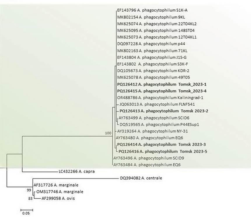Рис. 5. Филогенетическое дерево, построенное по фрагменту гена msp2 (340 п.н.) выявленных изолятов A. phagocytophilum.
