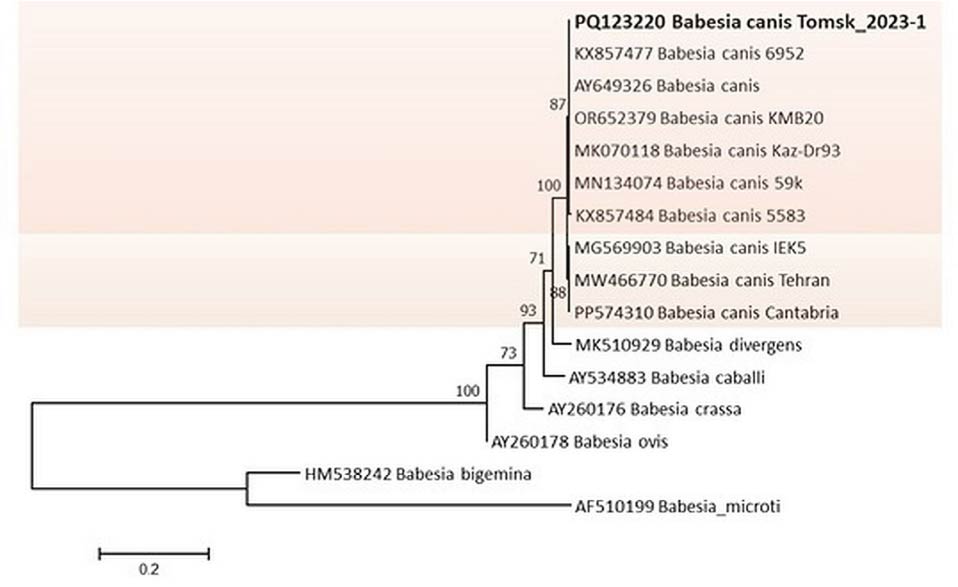 Рис. 6. Филогенетическое дерево, построенное по фрагменту гена 18S рибосомальной РНК (394 п.н.) выявленного изолята В. canis.