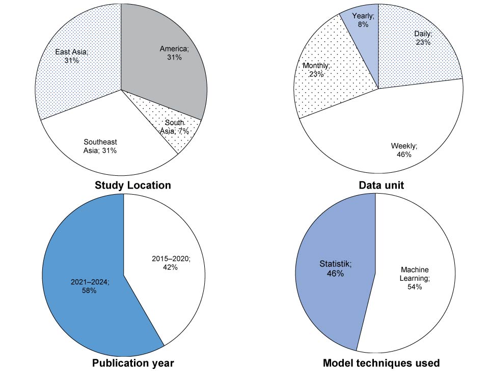 A total of 13 studies met the eligibility criteria and were included in this systematic review. Of these 13 studies, 4 (31%) were conducted in the Americas, 4 (31%) in East Asia, 4 (31%) in Southeast Asia, and 1 (7%) in South Asia. Brazil was the country with the highest number of eligible studies (n = 4) [25, 26, 33, 34], followed by China (n = 2) [27, 35], Taiwan (n = 2) [36, 37], Vietnam (n = 2) [28, 38]. Other studies were conducted in Malaysia [39], Sri Lanka [40], and the Philippines [41]. Five (42%) studies were published between 2015 and 2020, 9 studies between 2018–2022, and 7 (58%) studies were published between 2021–2024. Most studies (46%) used weekly time units, there were 23% studies using monthly data units, and the rest using annual and yearly. More than half (n = 7; 54%) of the studies used machine learning model techniques [25–28, 33, 36, 39], and the remaining (n = 5; 46%) studies used statistical model techniques [34, 35, 37, 38, 40, 41]. The characteristics of the included studies are summarized in Fig. 2. Details of the characteristics within each study are presented in Table 3.