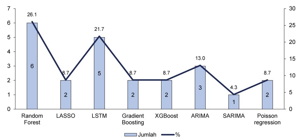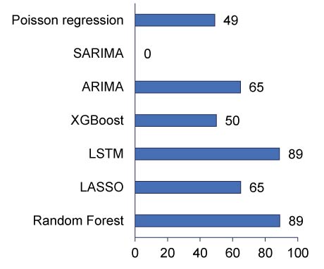 - studies that used or evaluated prediction or forecasting models, including machine learning methods (random forests, LSTM) or statistical models (such as ARIMA, Seasonal Autoregressive Integrated Moving Average (SARIMA), regression) (n = 19);