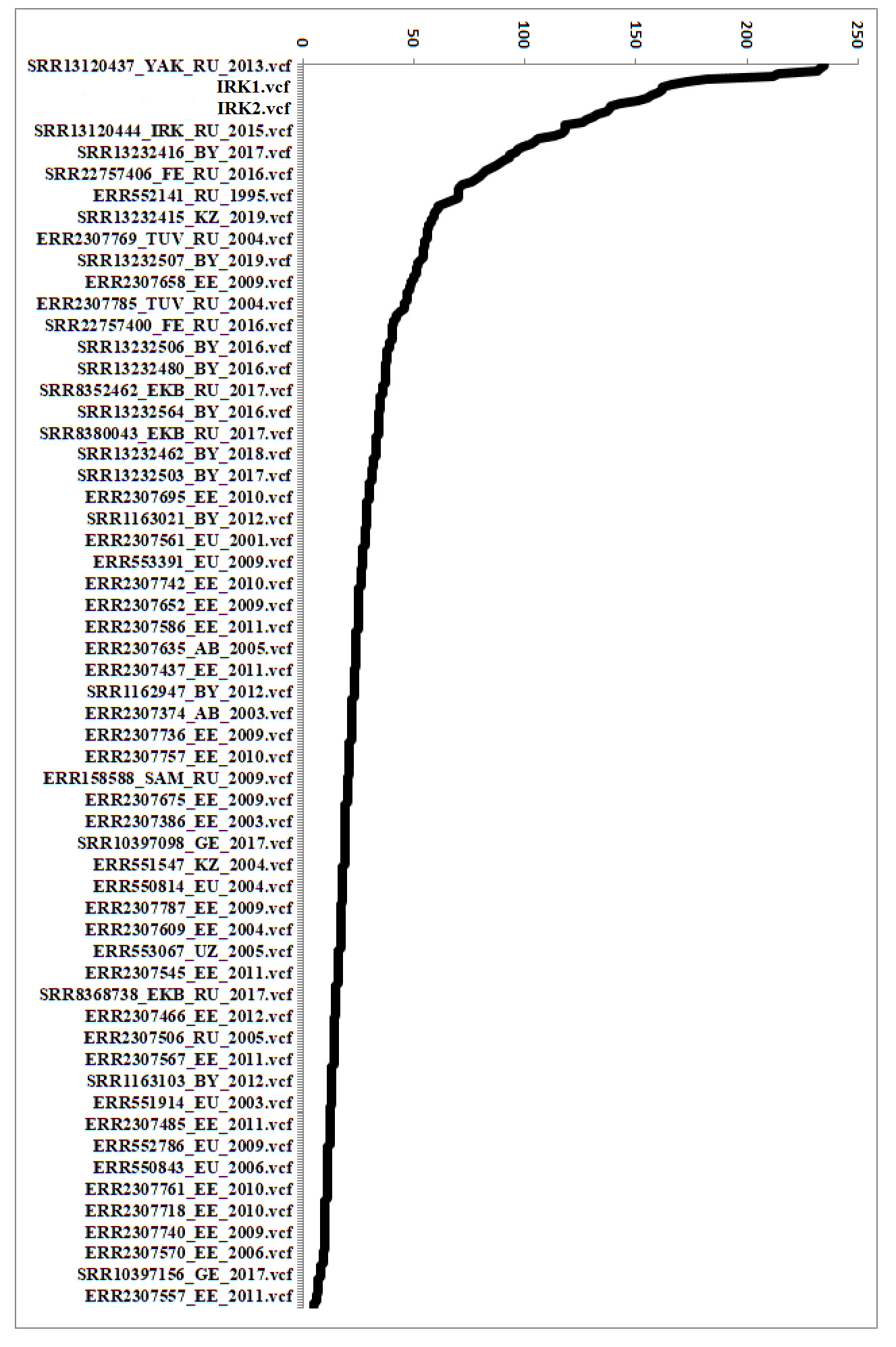 The Irk1 and Irk2 genomes tested occupy the highest positions in terms of heteroresistance values (214 and 212) at position 761155 (rpoB nucleotide substitution — S450L; Figure). The highest heteroresistance (235), expressed as the presence of alternative short reads at WGS at the position under study, was observed in only one genome from Yakutia isolated in 2013. We investigated the probability of occurrence of detected amino acid substitutions in the rpoC gene using two approaches: PAM (Point Accepted Mutation) matrices — PAM30 and PAM250 [9] and the SIFT (Sorting Intolerant From Tolerant) algorithm [10]. To predict amino acid substitutions affecting protein function, PAM matrices were used to estimate the probability of amino acid substitutions during evolution [9]. The SIFT algorithm was used to determine whether amino acid substitutions affect protein function using evolutionary information and homologous sequence alignments [10].