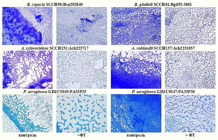 Fig. 4. Effect of FT on the formation of bacterial biofilms. Microphotographs of the formed biofilm fragments (the densest fragments) are shown.
