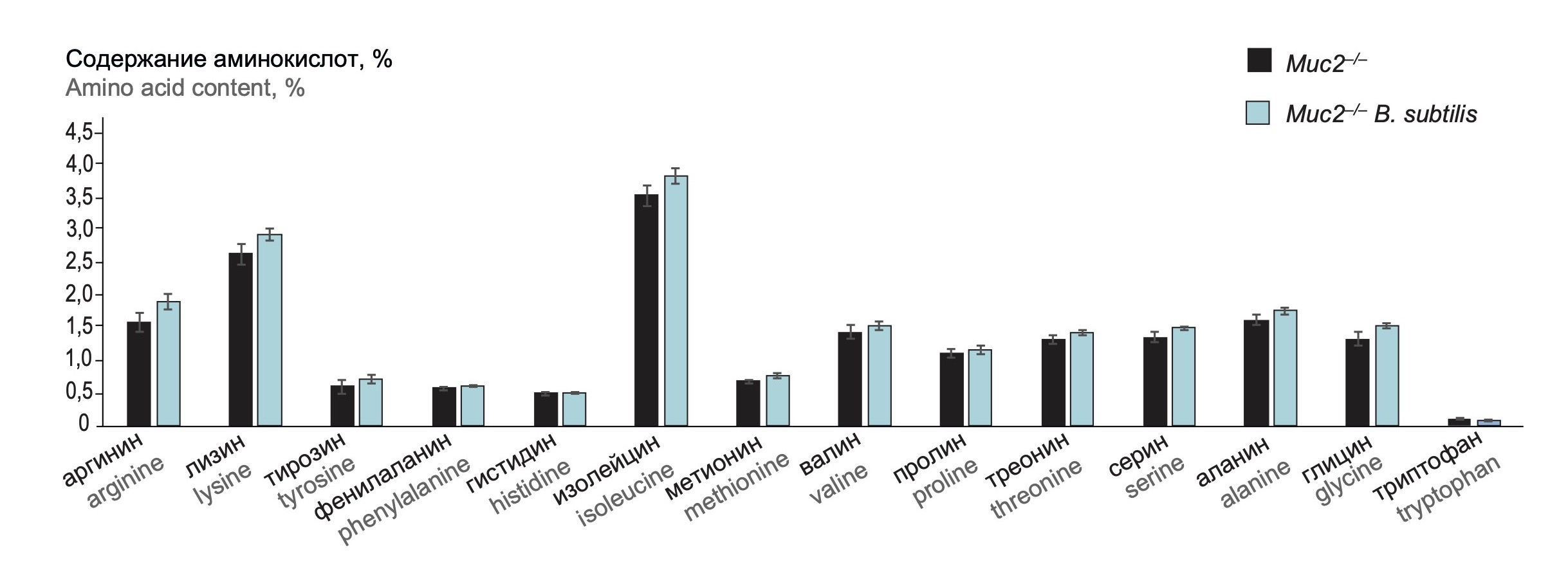 Materials and methods. Muc2–/– females were fed spores of Bacillus subtilis BS20 in the amount of 109 CFU for 2 months. Analysis of the amino acid composition of the femoral muscle was performed by capillary electrophoresis. The concentration of cytokines in the supernatant was measured using the Magnetic Luminex assay kit. Determination of the number of lymphocytes was performed by flow cytometry.