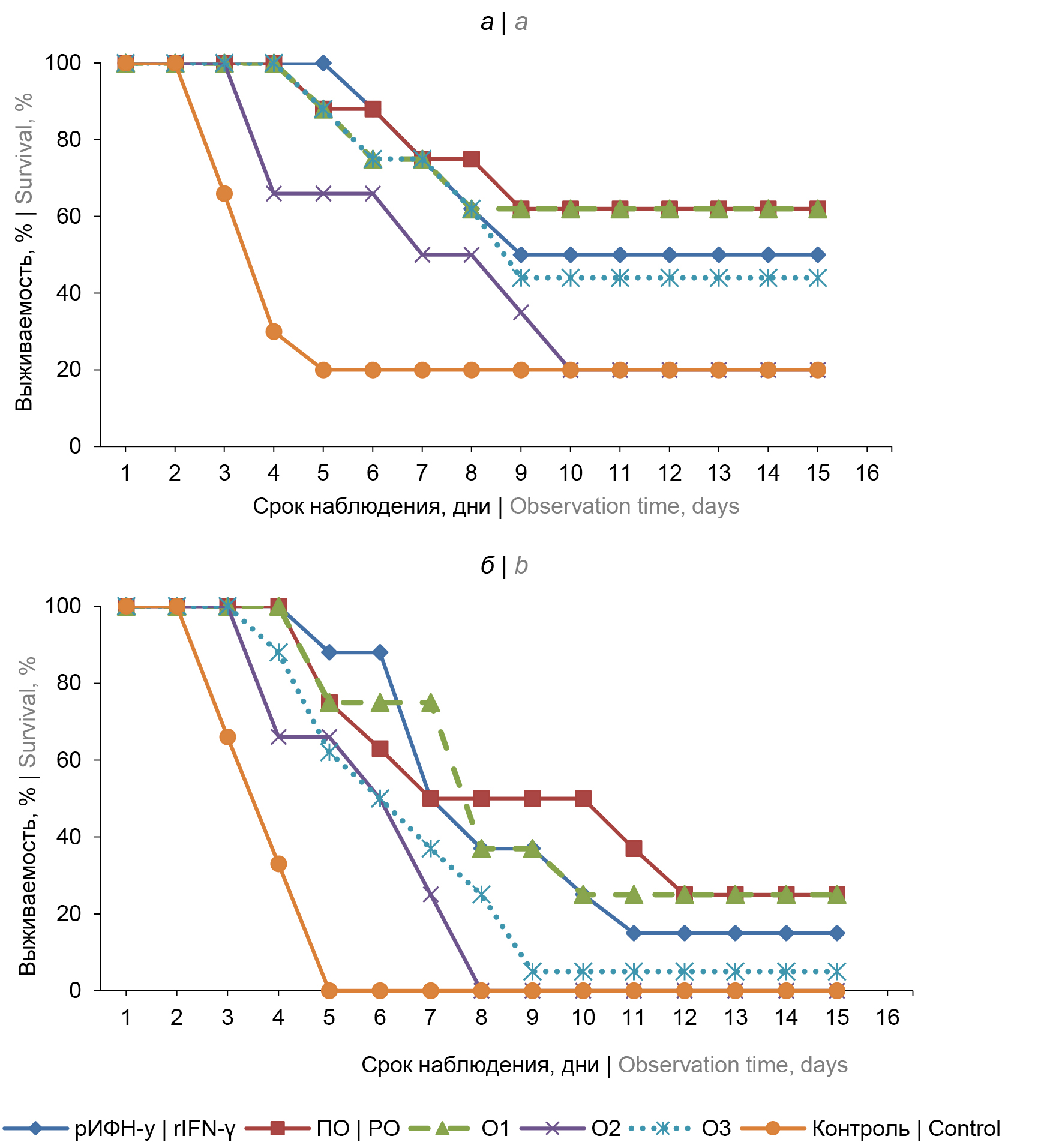 Fig. 1. The effect of immunomodulators on survival of white mice after subcutaneous challenge with 5 LD50 (а) и 25 LD50 (b) Y. pestis strain 231.