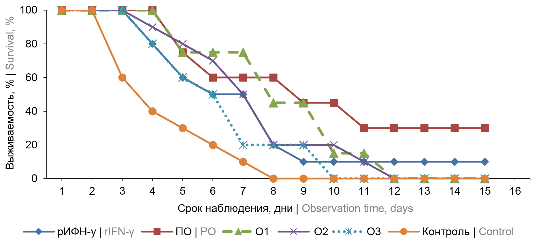 Установлено, что трёхкратное применение ИЛП до заражения белых мышей приводит к увеличению ЛД50 и ИИ во всех опытных группах, кроме животных, иммунизированных О2 (табл. 2). Выживаемость белых мышей, иммунизированных рИФН-γ, ПО, О1 и О3, составила в среднем 36, 59, 50 и 26% соответственно. При заражающей дозе 25–30 ЛД50 Y. pestis 231 выживаемость снижалась до 0–5%, кроме групп, иммунизированных рИФН-γ (15%), О1 и ПО (по 25%) (рис. 1).