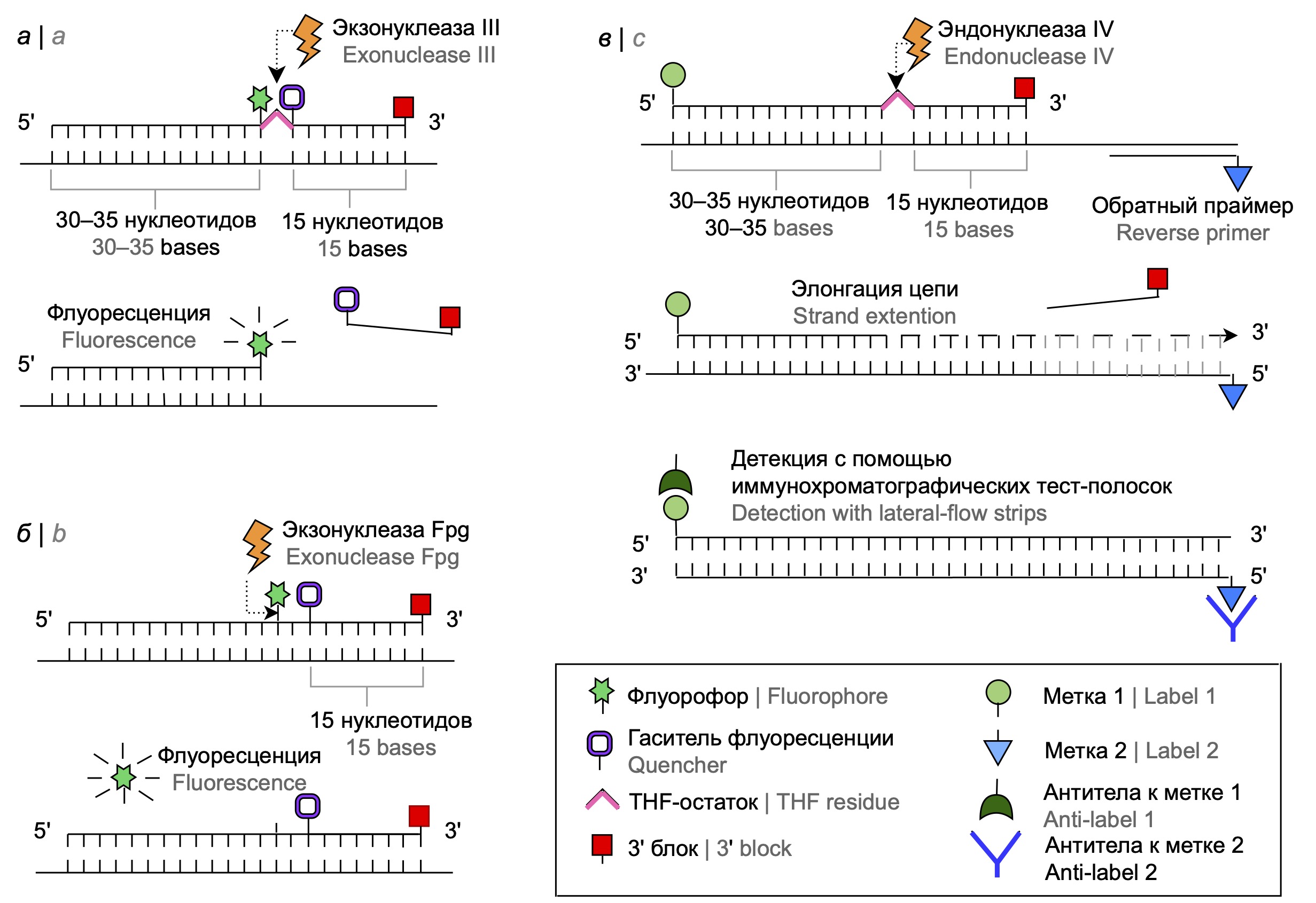 Рис. 3. Структура зондов и принцип детекции при использовании различных типов нуклеаз. а — экзонуклеаза III; б — экзонуклеаза Fpg; в — эндонуклеаза IV.