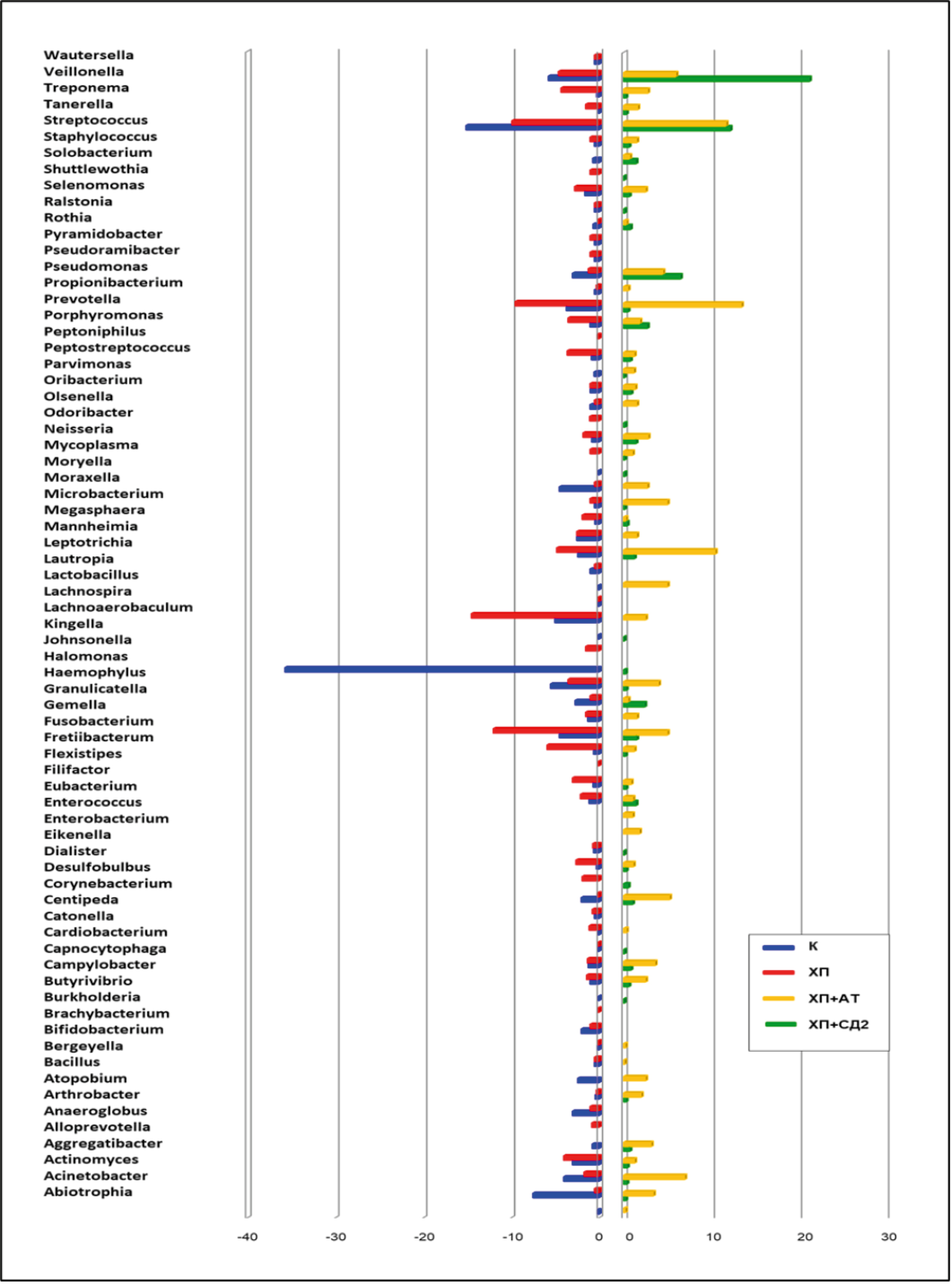 Representatives of the following genera predominated in the subgingival microbiome of healthy people: Haemophilus, Streptococcus, Abiotrophia, Granulicatella, Moraxella, Veillonella; in patients with CP without systemic pathology — Fusobacterium, Fretibacterium, Lachnoaerobaculum, Prevotella, Streptococcus; in CP + AT — Streptococcus, Veillonella, Propionibacterium; in CP + T2D — Prevotella, Streptococcus, Leptotrix, Veillonella, Actinomyces.