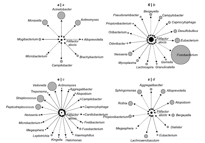 Evaluating the results of correlation analysis, several features should be emphasized. In all groups, the content of F. alocis bacteria was different – from minimal in the association of CP and AT to maximum in CP without systemic effects. In the composition of correlation pairs there was not a single genus of bacteria that occurred in all 4 groups. The diagrams presented in our work indicate the existence of numerous correlations between F. alocis and other components of the microbiome, which, in combination with the data on the presence of its exotoxin, as well as A. actinomycetemcomitans [12], allows us to raise the question of its classification as a periodontal pathogenic species of the first order.