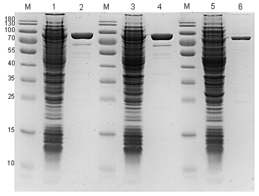 Plasmid DNA containing the gene of the chimeric enzyme was treated with the NdeI and XhoI restriction endonucleases, and the resulting restriction product was cloned into the pET16b+ plasmid vector, which had been pre-treated with the same restriction endonucleases. As a result, expression vectors containing genes that encode the following hybrid proteins were obtained: Bst_Sso7d with a molecular weight of 75 kDa, Bst_Sso7d_mut4 with a molecular weight of 75.2 kDa, and Btlv_Sso7d with a molecular weight of 75 kDa. The accuracy of the nucleotide sequence of the cloned genes was confirmed by sequencing.