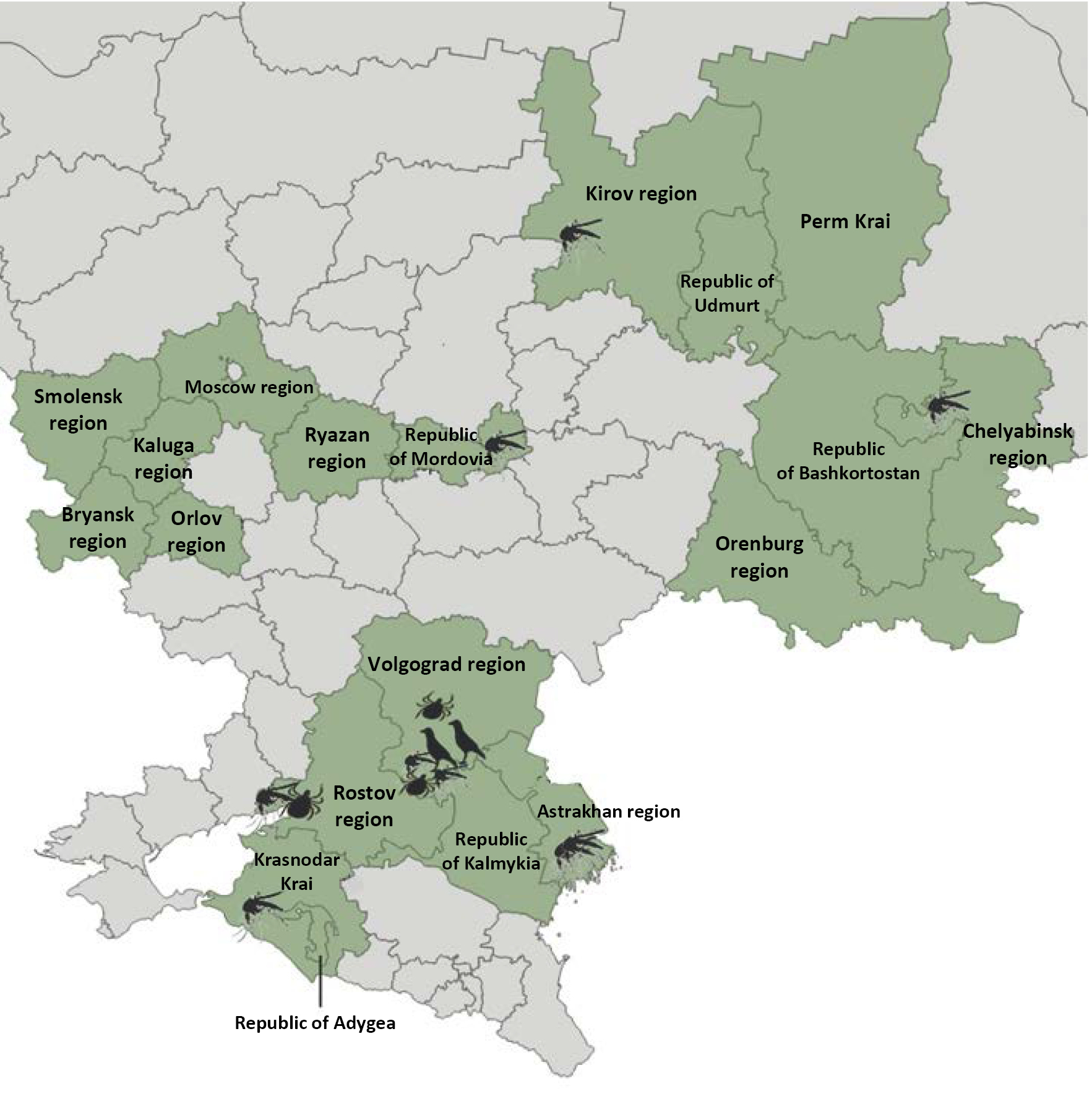 In the other surveyed regions, infected carriers of WNV were not found, which does not rule out the presence of WNV foci and requires conducting repeated studies with the selection of other biotopes for field sample collection.