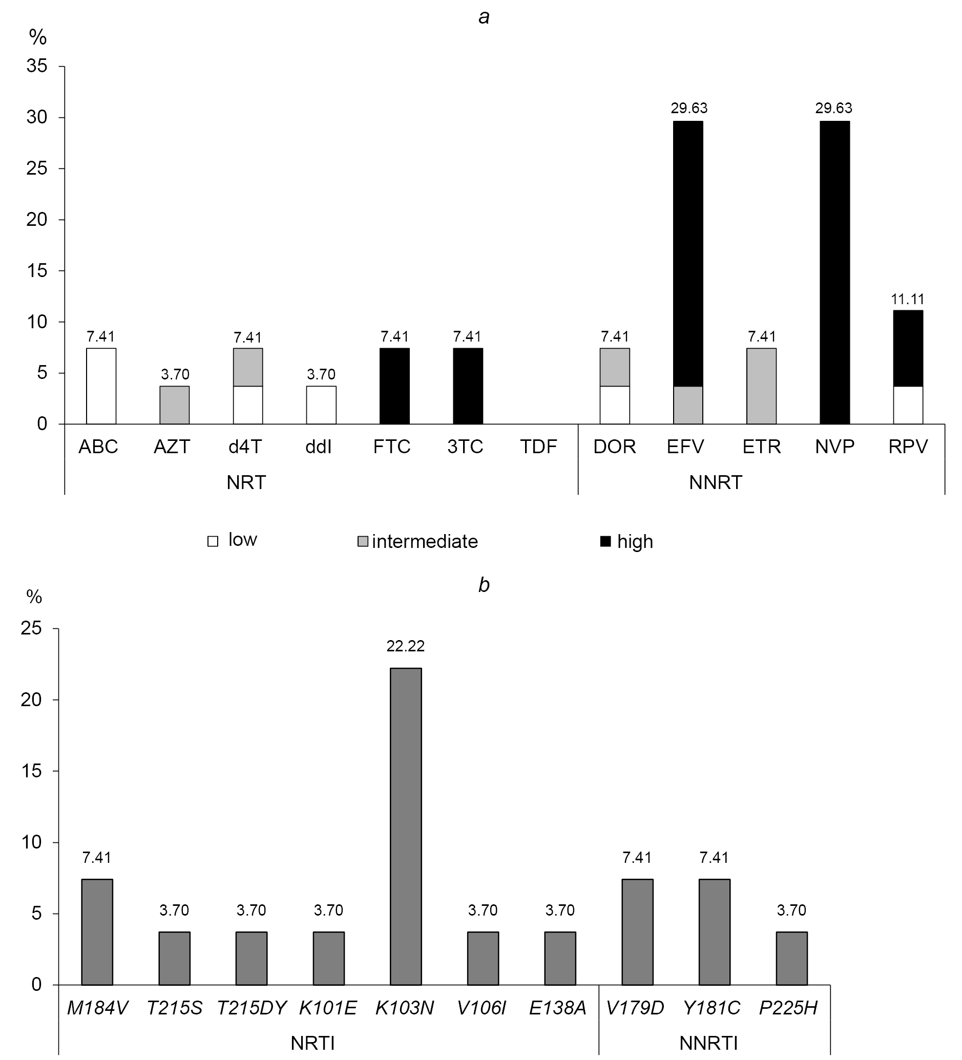 Fig. 3. Results of the analysis of occurrence frequency for drug resistance (a) and drug resistance mutations to HIV-1 inhibitors of the NRTI and NNRTI classes (b).