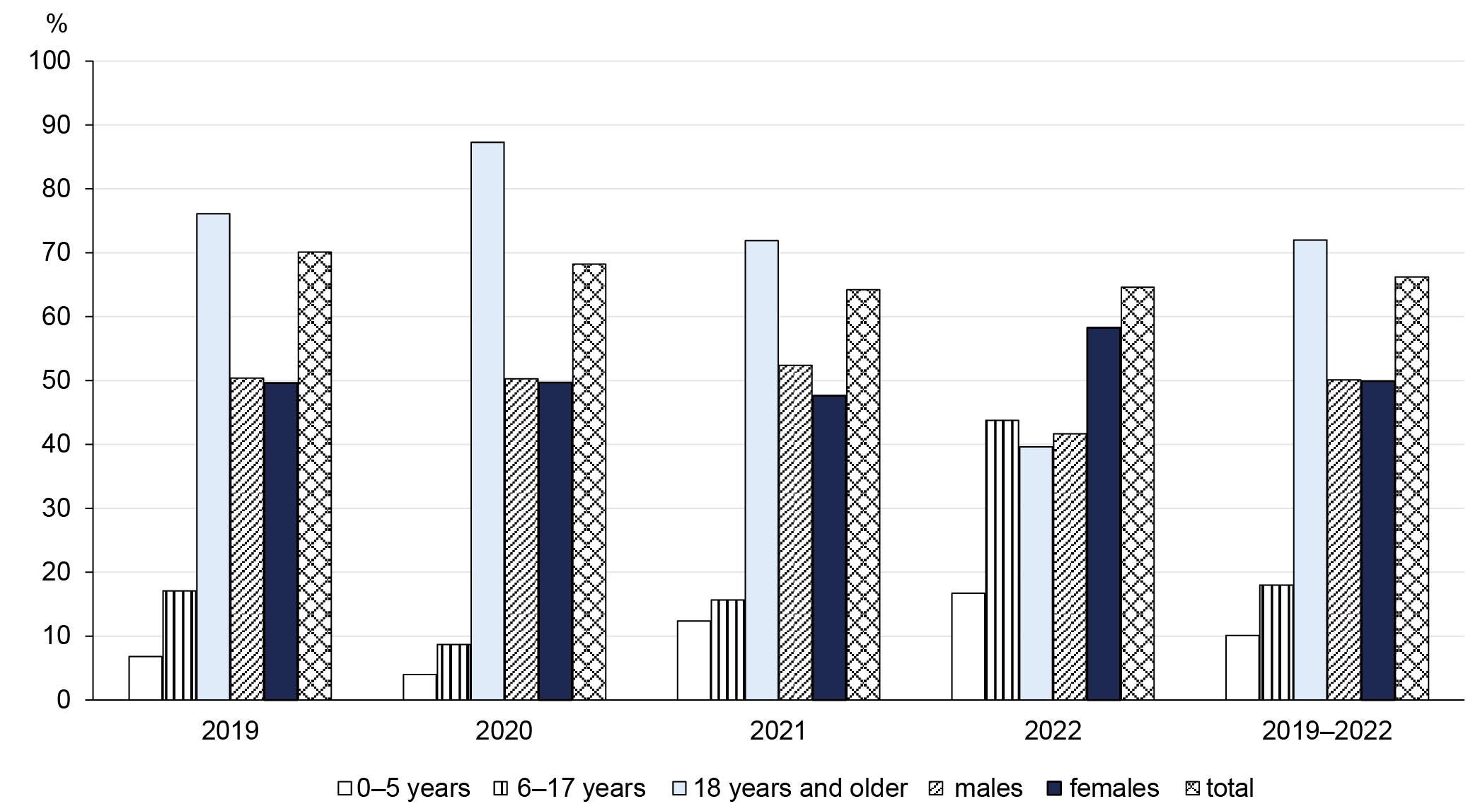 According to the combined data, between 2019 and 2022, genetic markers of viral and bacterial pathogens of acute intestinal infections were detected in stool samples from 479 (66.2%) examined individuals: in 238 (49.7%; 95% CI 45.2–54.2%) men and 241 (50.3%; 95% CI 45.9–54.8%) women (p > 0.05). Determinants of the pathogens of interest were more frequently detected in the age group of patients 18 years and older — 331 (69.1%; 95% CI 64.8–73.1%; p ≤ 0.05). No significant differences were found in the detection rate of DNA/RNA of pathogens causing acute intestinal infections in samples from young children (n = 59; 12.3%, 95% CI 9.7–15.6%) and school-aged children (n = 89; 18.6%; 95% CI 15.5–22.3%) (Mann–Whitney test). No statistically significant differences (p ≤ 0.05) were found in the detection frequency of genetic markers of acute intestinal infections of established etiology based on sex and age, both in the combined data and separately by year (Fig. 1).