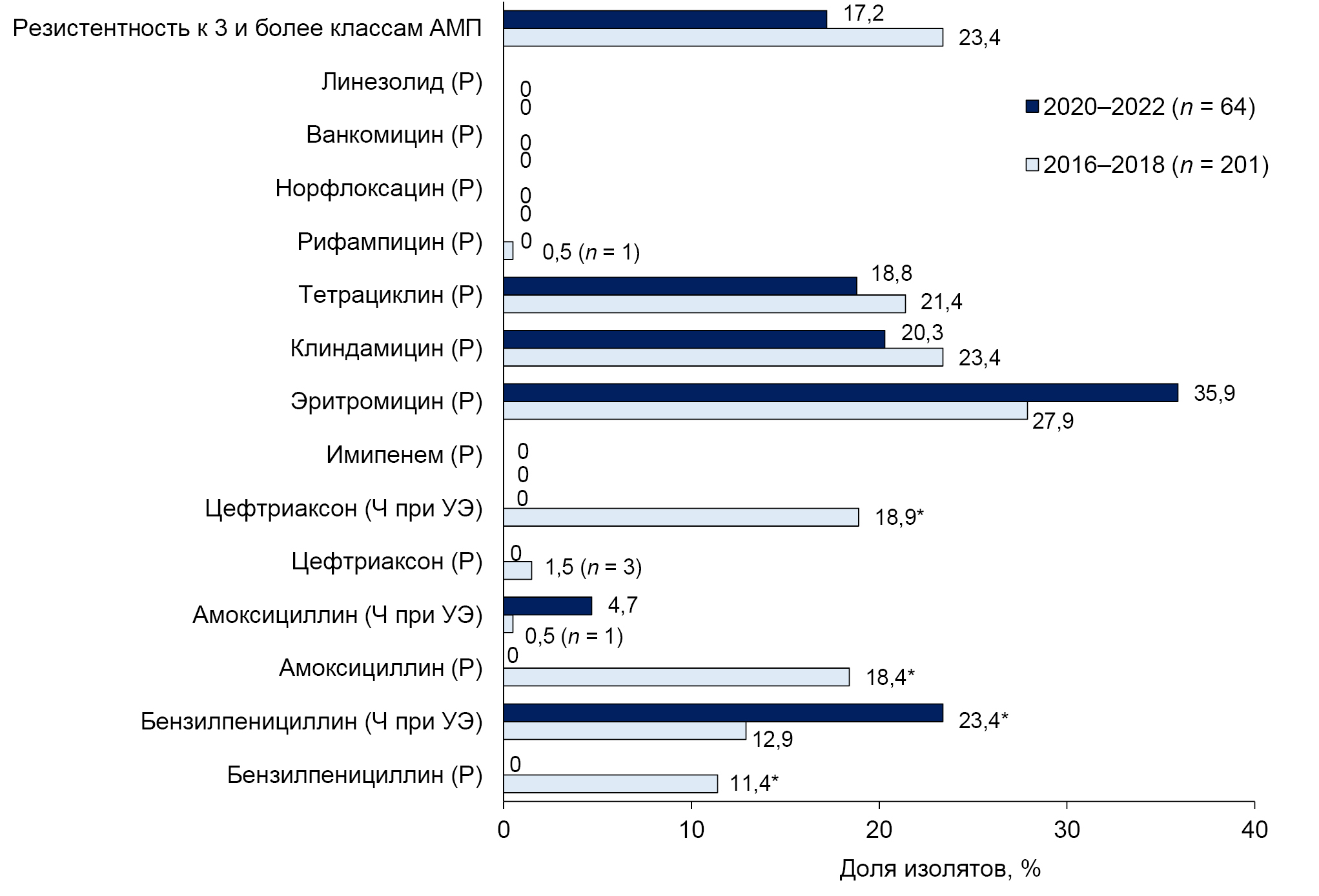Results. 265 isolates of S. pneumoniae were studied, and resistance to antimicrobials was found in 36.6%. The proportion of resistant isolates was 33.8% in the early post-vaccination period (2016–2018) and 45.3% in the late period (2020–2022) (p = 0.097). Penicillin-resistant pneumococci were detected only in the early post-vaccination period, with a frequency of 11.4% (p = 0.005). The prevalence of macrolide-resistant isolates in the analyzed periods was 27.9% and 35.9% (p = 0.219), and those resistant to 3 or more classes of antibiotics were 23.4% and 17.2%, respectively (p = 0.297). The serotype composition of resistant S. pneumoniae has changed: vaccine serotypes 19F, 6A, 6B, etc. (83.8%) have been replaced by non-vaccine serotypes – 15AF, 23A, etc. The proportion of vaccine serotypes in the late post-vaccination period was only 10.3%.