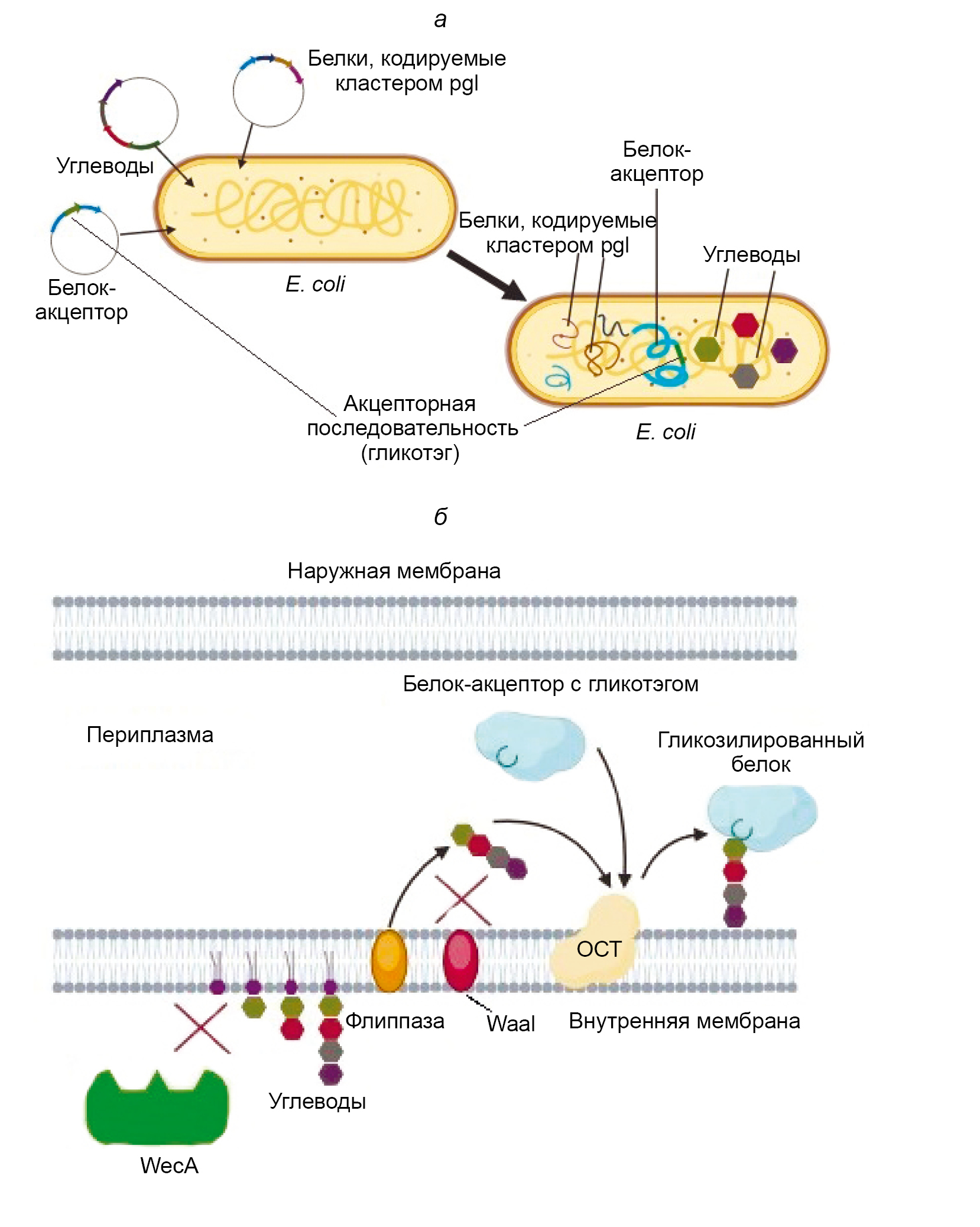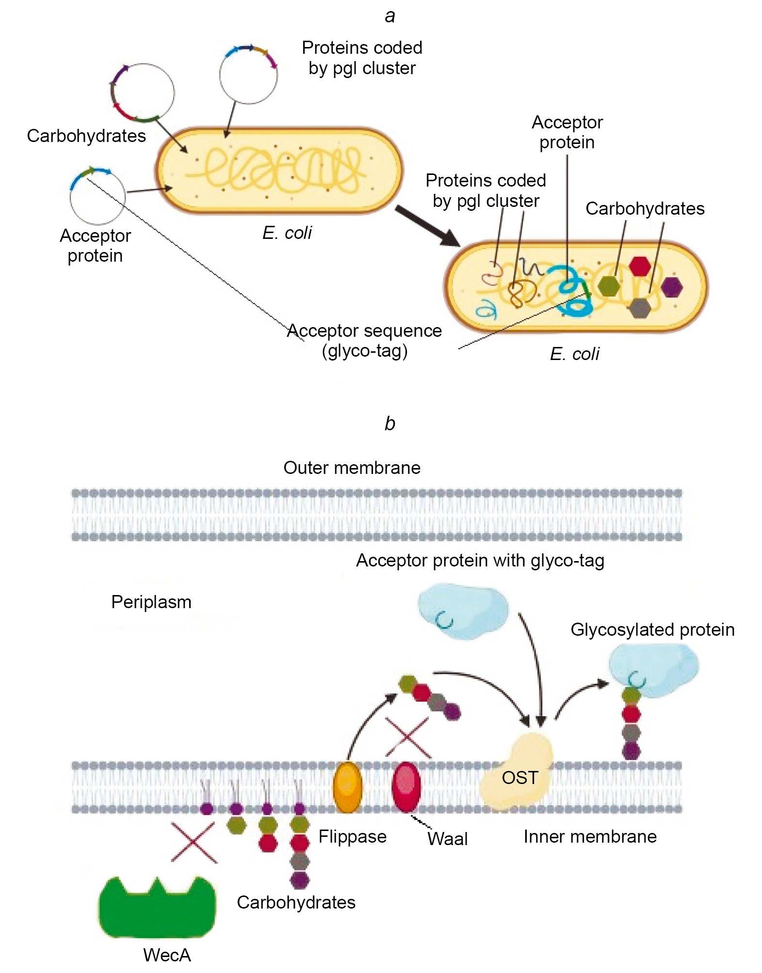a — the stage of transforming bacteria with plasmids containing nucleotide sequences that encode, respectively, a carrier protein with an acceptor sequence specific to the used OST, a set of carbohydrates necessary for its glycosylation, and a cluster containing the enzymes required for glycosylation; b — the process of glycosylation itself, occurring on the inner membrane of E. coli cells modified for more efficient bioconjugate synthesis.