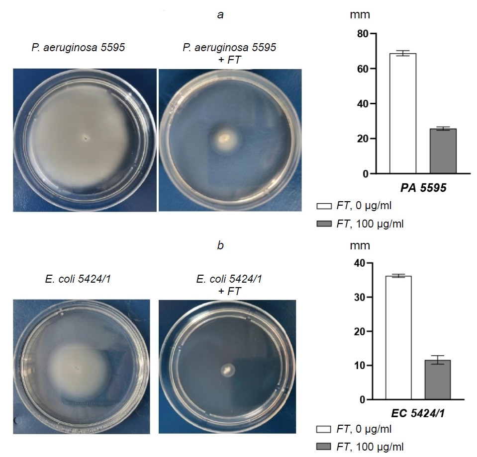 Representative images of swimming motility on Petri dishes and assessment of the change in the diameter of the zone of motility of P. aeruginosa 5595 (a) and E. coli 5424/1 (b) in the presence of FT at a concentration of 100 μg/mL. Error bars represent the SD of 2 replicates.