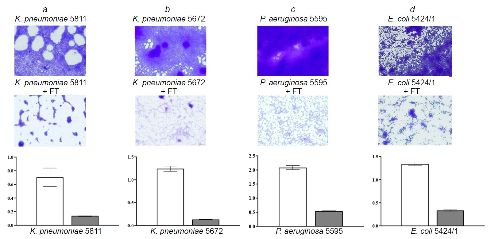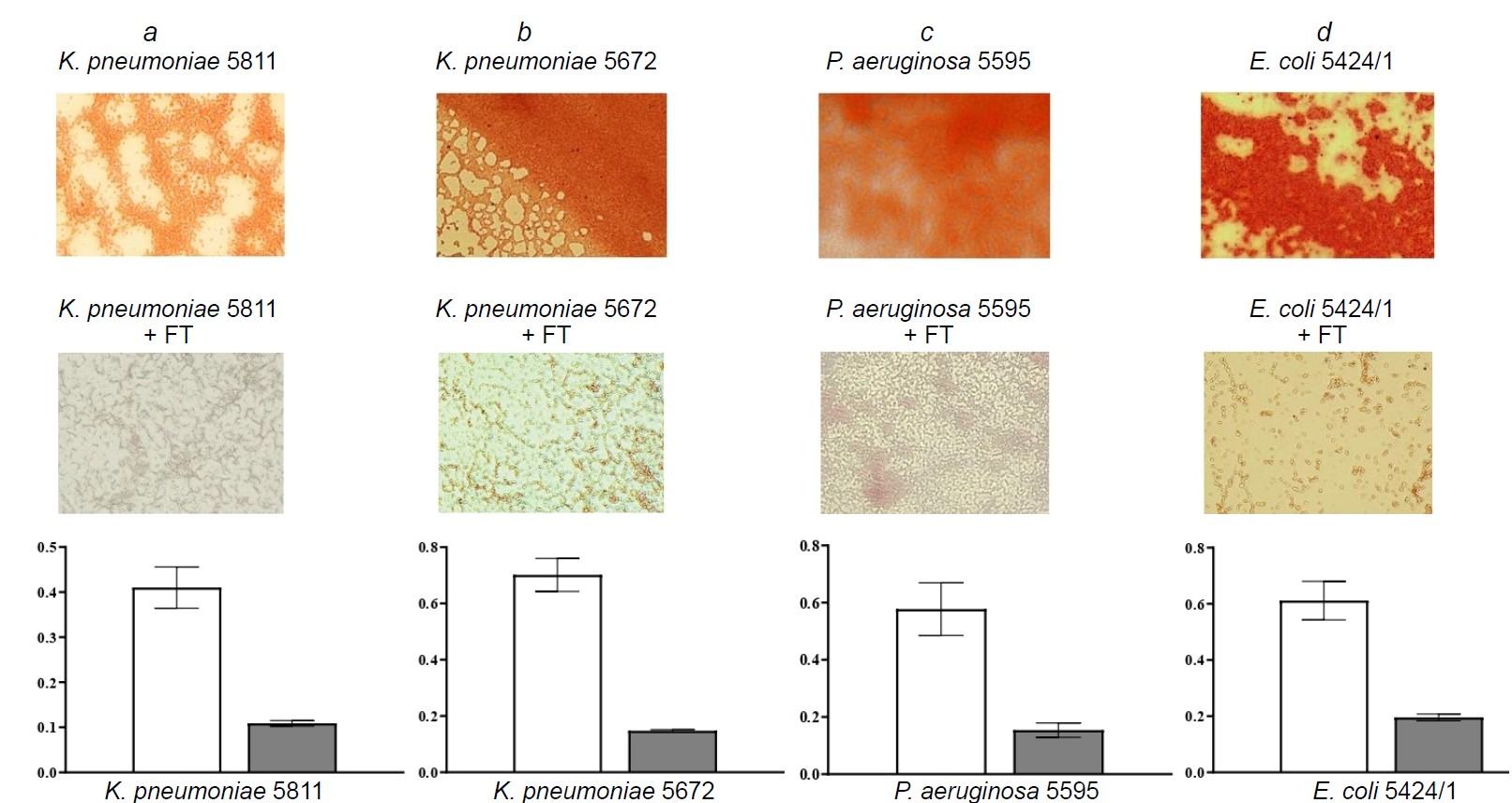 New approaches in treating such chronic infections should be based on understanding the pathogenesis mechanisms and on blocking of specific links of these mechanisms. In the current study, we evaluated the effect of the active pharmaceutical substance, antibacterial drug FT, on the expression of virulent properties of clinical isolates of 3 different species: K. pneumoniae, P. aeruginosa and E. coli under in vitro conditions.