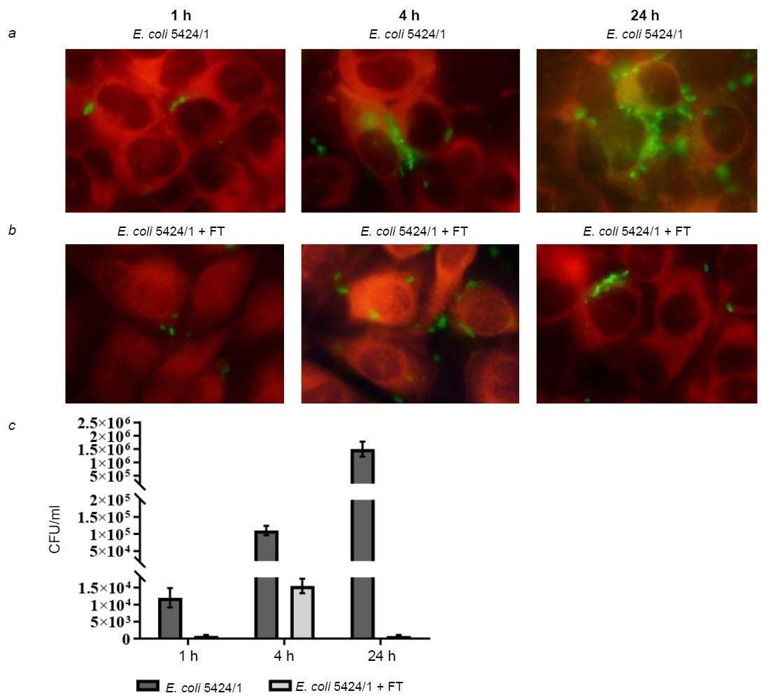 For the E. coli 5424/1 isolate, an inoculum of 1.5 × 106 CFU/mL was used for infection, which resulted in MOI55. After 1 hour, the invasion rate was 0.47%, while under the effect of FT, it was 0.053%. After 4 hours, the number of intracellular bacteria in the control group was 2.1 × 105 CFU/mL, while in the presence of FT, it was an order of magnitude lower, at 1.1 × 104 CFU/mL. After 24 hours, an increase in the number of E. coli 5424/1 was observed to 2.4 × 106 CFU/mL in the control samples, while bacterial growth was significantly reduced in the presence of FT to 7.5 × 102 CFU/mL.