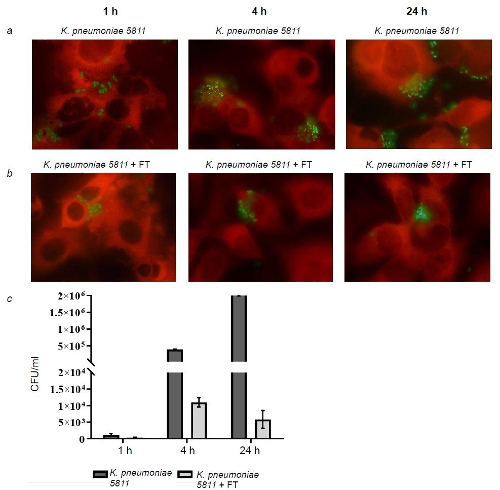 For the K. pneumoniae 5811 isolate, IBC formation was also observed, and it was suppressed in the presence of FT. This isolate showed lower rate of invasion, which was 0.005% for the control, while almost similar rate of invasion was observed under FT treatment. This isolate showed lower rate of invasion, which was 0.005% for the control and similar for the FT treatment group. (бы я исправила) This isolate showed to have effective intracellular replication: after 4 hours, the number of intracellular bacteria was 5 × 105 CFU/mL, and after 24 hours, it was 2.0 × 106 CFU/mL. Under the effect of FT, bacterial replication? was suppressed — 5.9 × 102 CFU/mL after 24 hours. The inhibition of IBC formation in the presence of FT is clearly demonstrated in the microphotographs (Fig. 5).