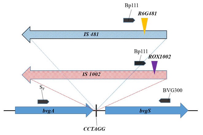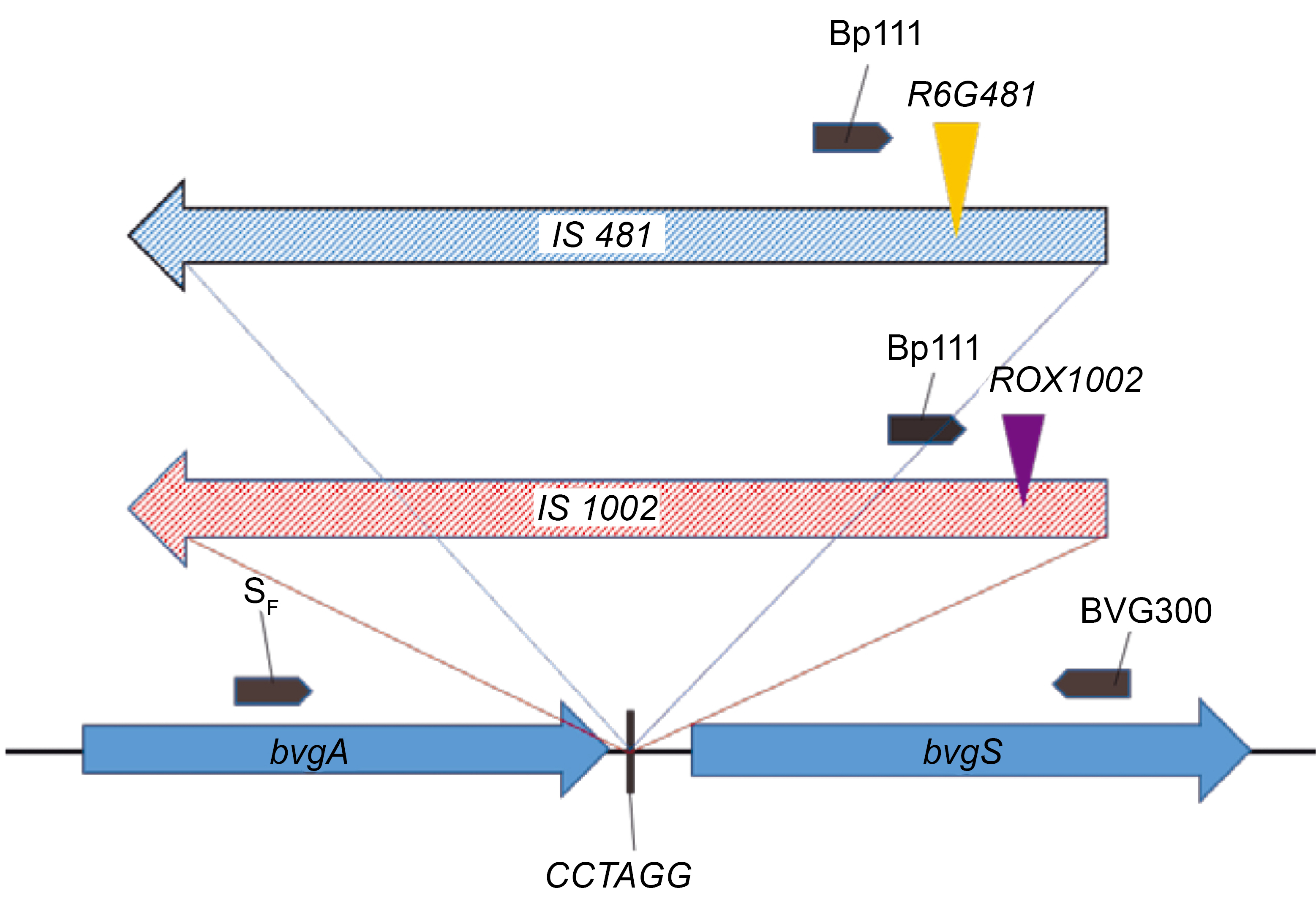Among the described mutations in the virulence genes of the whooping cough pathogen, insertion mutations — the integration of IS elements into the specific site of the B. pertussis bvgAS operon — deserve special attention, according to our hypothesis. In previous studies, we described a method and test systems for detecting mutations in the bvgAS operon, which contains IS elements 481 and 1002 integrated in a specific, at that time the only known, orientation, which we conditionally designated as orientation (1) [13].