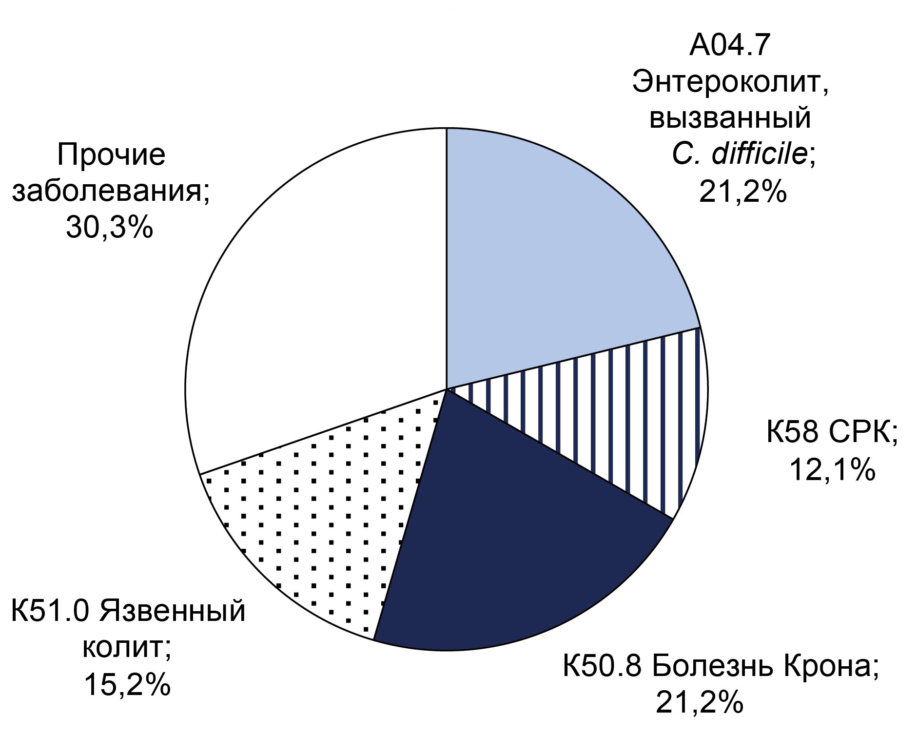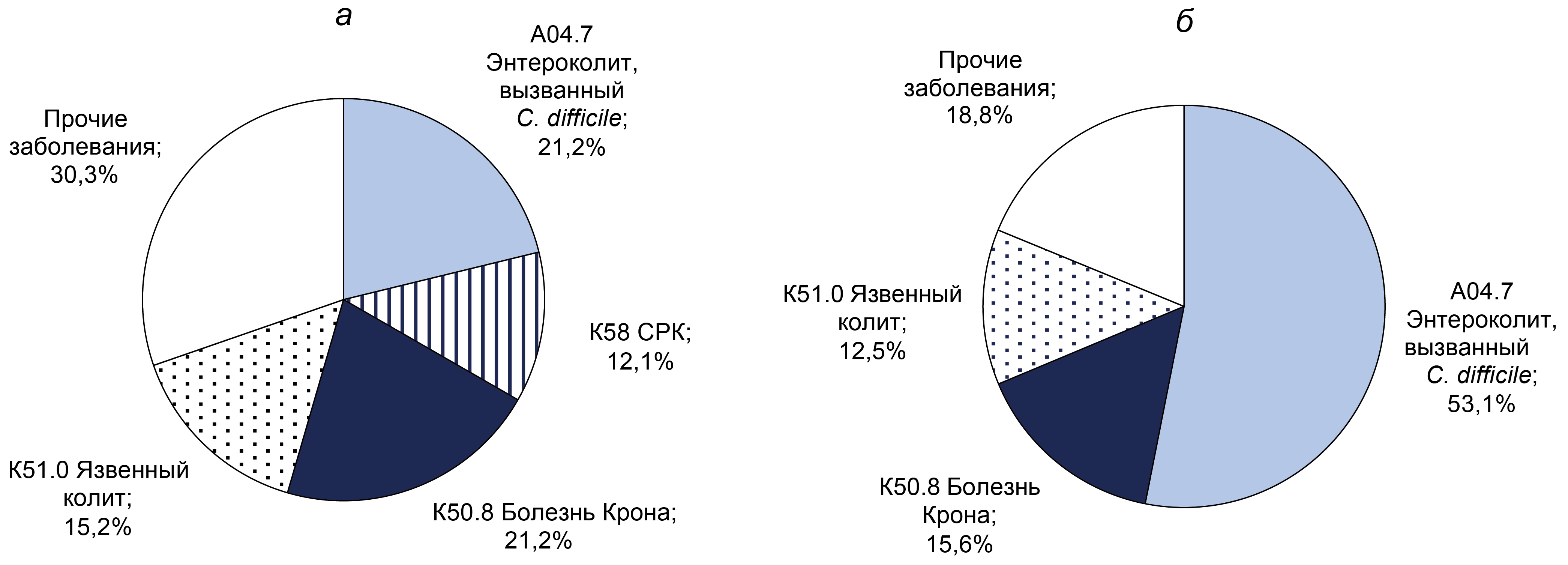 Results. C. difficile DNA was detected in 65 (11.9%) patients, and toxins A and B genes were found in 32 (5.9%) patients. Non-toxigenic strains were more frequently detected in men (55%) under 40 years, while toxigenic strains were equally frequent in both sexes under 40. CRP analysis indicated that inflammatory processes were more likely in patients over 40 years old. The predominant diagnosis in toxigenic strain carriers with high CRP was C. difficile-associated enterocolitis (ICD-10: A04.7), whereas in the non-toxigenic group, it was ulcerative colitis (ICD-10: K51). Extended bacteriological analysis revealed significant gut microbiota imbalances in all patients.