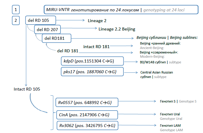 Materials and methods. The MIRU-VNTR genotyping of 163 M. tuberculosis strains isolated from TB patients in the Kemerovo Region in March–October 2022 was carried out. Cultivation of M. tuberculosis, drug susceptibility testing, and isolation of genomic DNA were carried out by standard methods. Genotypic identification was performed using MIRU-VNTR (24 loci) typing. In parallel, express genotyping was carried out: identification of isolates of the Beijing genotype (by RD105/207) and non-Beijing; subtyping Beijing using real-time PCR tests for detection of Central Asian Russian and B0/W148; identification of the non-Beijing group by real-tine PCR RT tests for LAM, S, Ural.