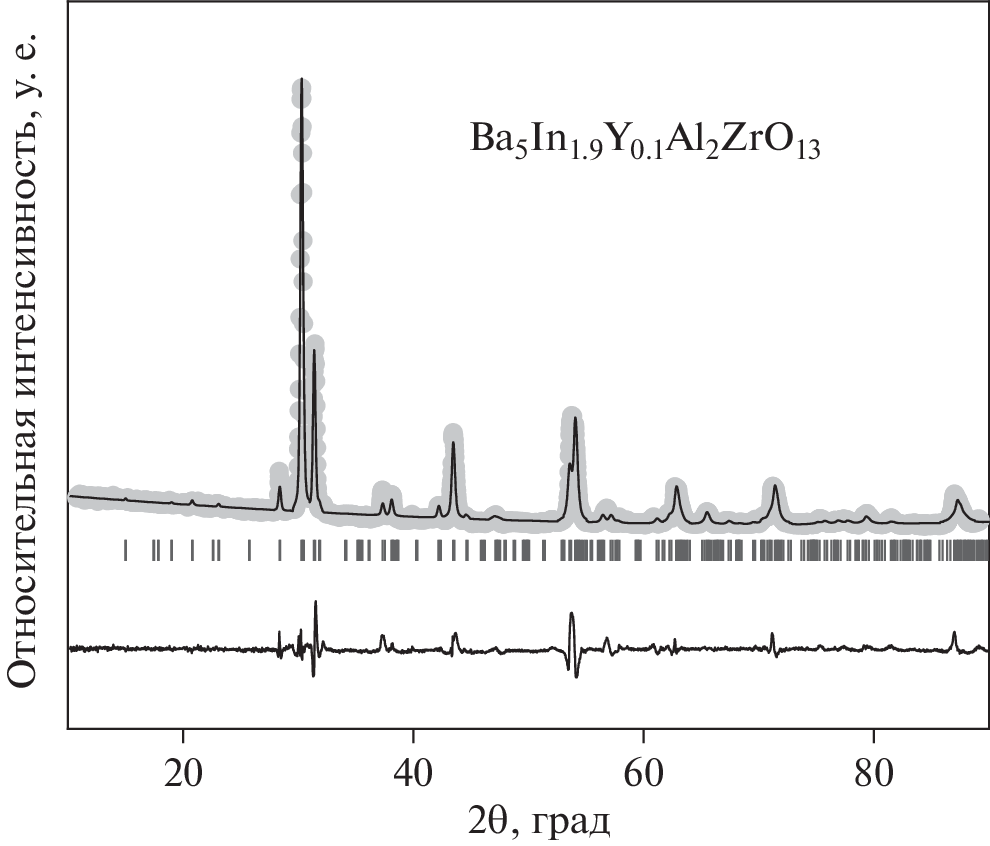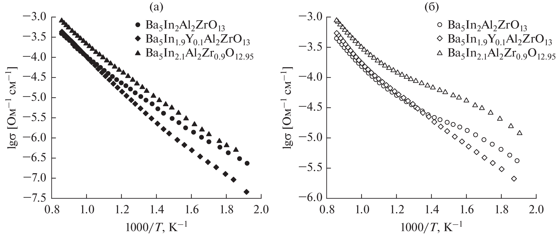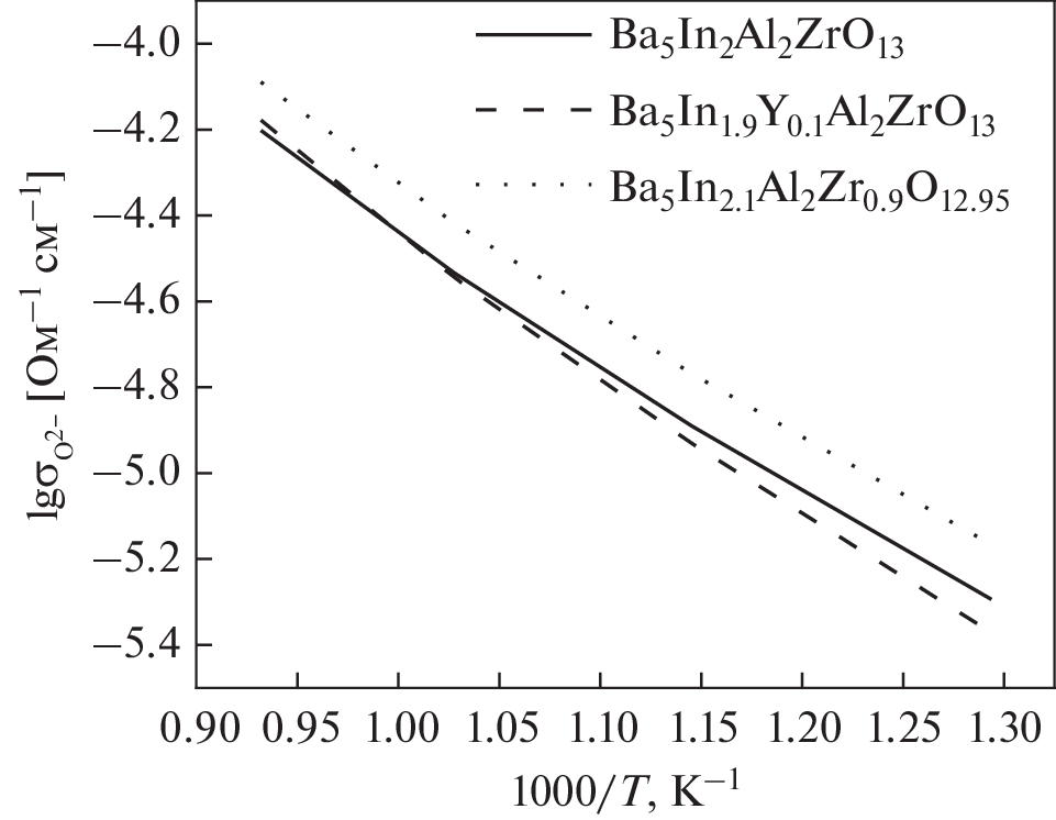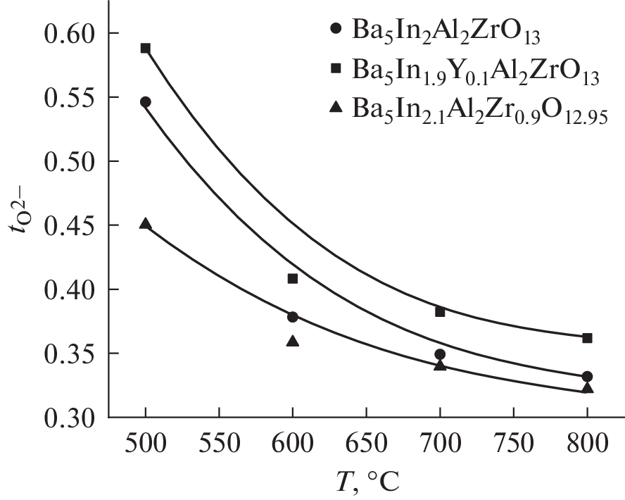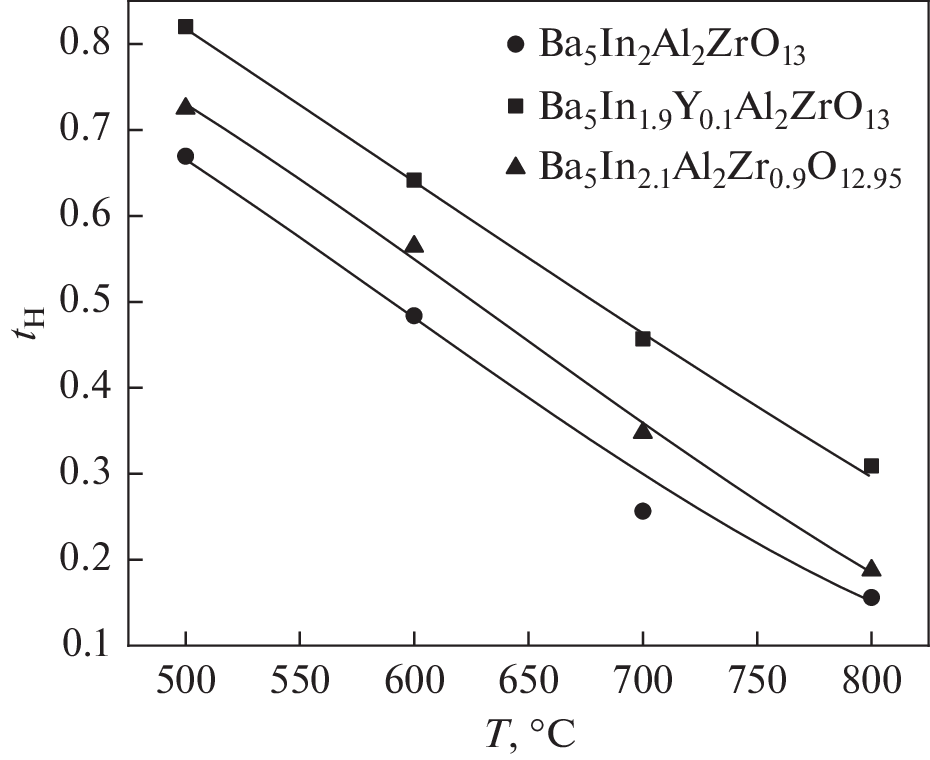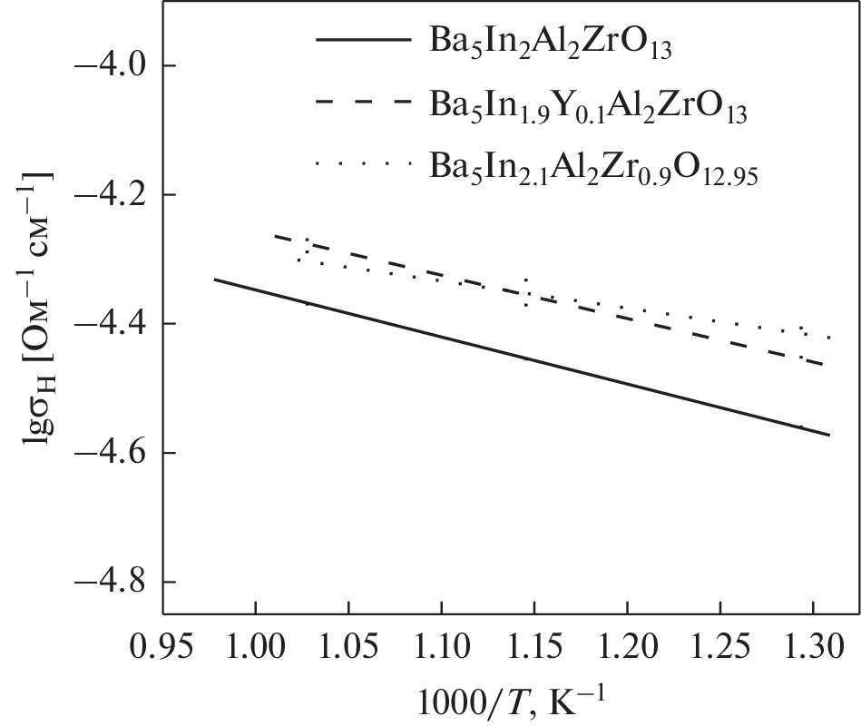 A complex oxide Ba5In1.9Y0.1Al2ZrO13 with hexagonal perovskite structure (a = 5.971(4) Å, с = 24.012(1) Å) is prepared for the first time. The phase is found to dissociative-absorb water from gas phase, the degree of hydration being as high as 0.39 mol Н2О. It was found by using IR-spectroscopy that protons are present therein as energetically nonequivalent ОН–-groups involved in hydrogen bonds of diverse strength. Isovalent yttrium-doping of the Ba5In2Al2ZrO13 phase is shown not to lead to any valuable change in the oxygen-ion-conductivity as compared with the Ba5In2.1Al2Zr0.9O12.95 acceptor doping that allows increasing the oxygen-ion-conductivity by a factor of 1.3. Both types of doping lead to increase in the proton conductivity and, as a corollary to this, an increase in the proton concentration. For these phases the degree of hydration depends on the cell parameters, hence, is determined by space availability for ОН–-groups in the barium coordination. Proton transport dominates in the Ba5In2Al2ZrO13, Ba5In2.1Al2Zr0.9O12.95, and Ba5In1.9Y0.1Al2ZrO13 phases below 600оС in humid atmosphere (pH2О = 1.92 × 10–2 atm).