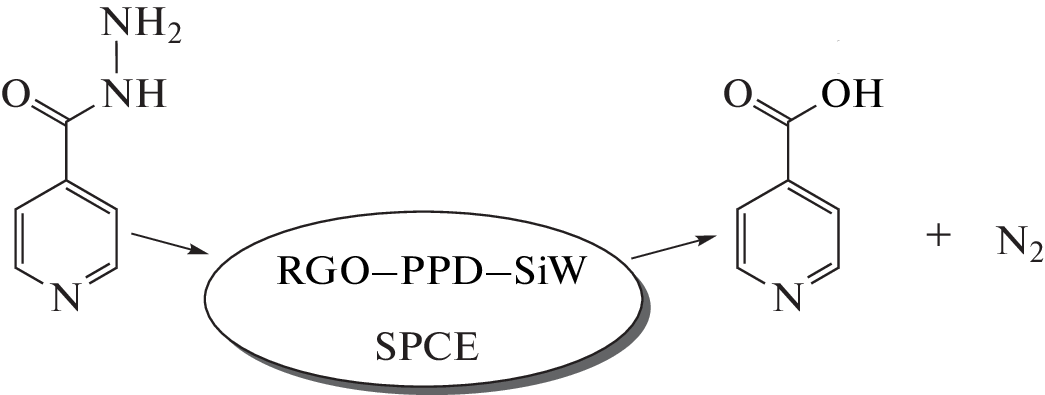 A new redox-active composite material based on reduced graphene oxide (RGO), poly-o-phenylenediamine (PPD), and silicotungstic acid (SiW) is studied. The SEM data showed an abrupt decrease in the content of oxygen atoms in the composite as compared to pure graphene oxide (GO). This is associated with its reduction to RGO in the course of RGO–PPD–SiW synthesis. A combination of RGO conductivity and redox catalysis due to the electroactive components (PPD and SiW) enables one to develop various sensors by applying RGO–PPD–SiW onto planar electrodes (screen-printed carbon electrodes, SPCE). In this work, the possibility of developing a sensor for the content of antituberculous antibiotic isoniazid (isonicotinic acid hydrazide C6H7N3O, INAH) is studied. Using the CVA method, it is shown that the concentration dependence of isoniazid oxidation current is linear. The electrocatalytic behavior of the composite during the isoniazid oxidation is also supported by the impedance spectroscopy.