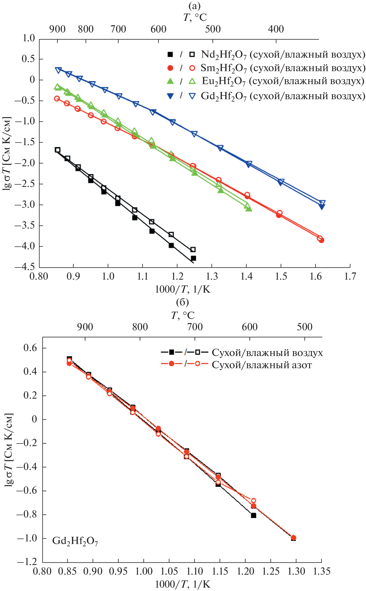 In this work, a high-density ceramics Ln2Hf2O7 (Ln = La, Nd, Sm, Eu, Gd) were synthesized by mechanical activation followed by high-temperature synthesis at 1600°C (3–10 h) and their transport properties were compared with those of Ln2.1Hf1.9O6.95 (Ln = La, Nd, Sm, Eu) doped solid solutions. The total conductivity of ceramics was studied using impedance spectroscopy and dc four-probe method; for Ln2Hf2O7 (Ln = Sm, Eu), by determining the total conductivity as a function of oxygen partial pressure. The maximum oxygen-ion conductivity was observed for Gd2Hf2O7 (~1 × 10–3 S/cm at 700°C); it was shown to approach the conductivity of Gd2Zr2O7 (~2 × 10–3 S/cm at 700°C) for the first time. Thus, the gadolinium hafnate can be a promising material for further doping in order to obtain highly conductive electrolytes. Among pure rare-earth hafnates, the proton conductivity was reliably observed for Nd2Hf2O7 only; however, ac measurements detected low-temperature proton conductivity in the Gd2Hf2O7 up to 450°С as well. With a decrease in the lanthanide ionic radius, the oxygen-ion conductivity increased in the Ln2Hf2O7 (Ln = La, Nd, Sm, Gd) series. Although the conductivity of samarium hafnate is an order of magnitude lower than that of Gd2Hf2O7, it has a wide range of oxygen-ion conductivity (~10–18–1 atm at 700, 800°C); there is no contribution from hole conductivity in air, in contrast to Eu2Hf2O7. Among doped Ln2.1Hf1.9O6.95 pyrochlore solid solutions (Ln = La, Nd, Sm, Eu), the proton conductivity of ~8 × 10−5 S/cm at 700°C was shown in Ln2.1Hf1.9O6.95 (Ln = La, Nd). With a decrease in the lanthanide ionic radius, the proton conductivity disappeared; the oxygen-ion one, increased.
