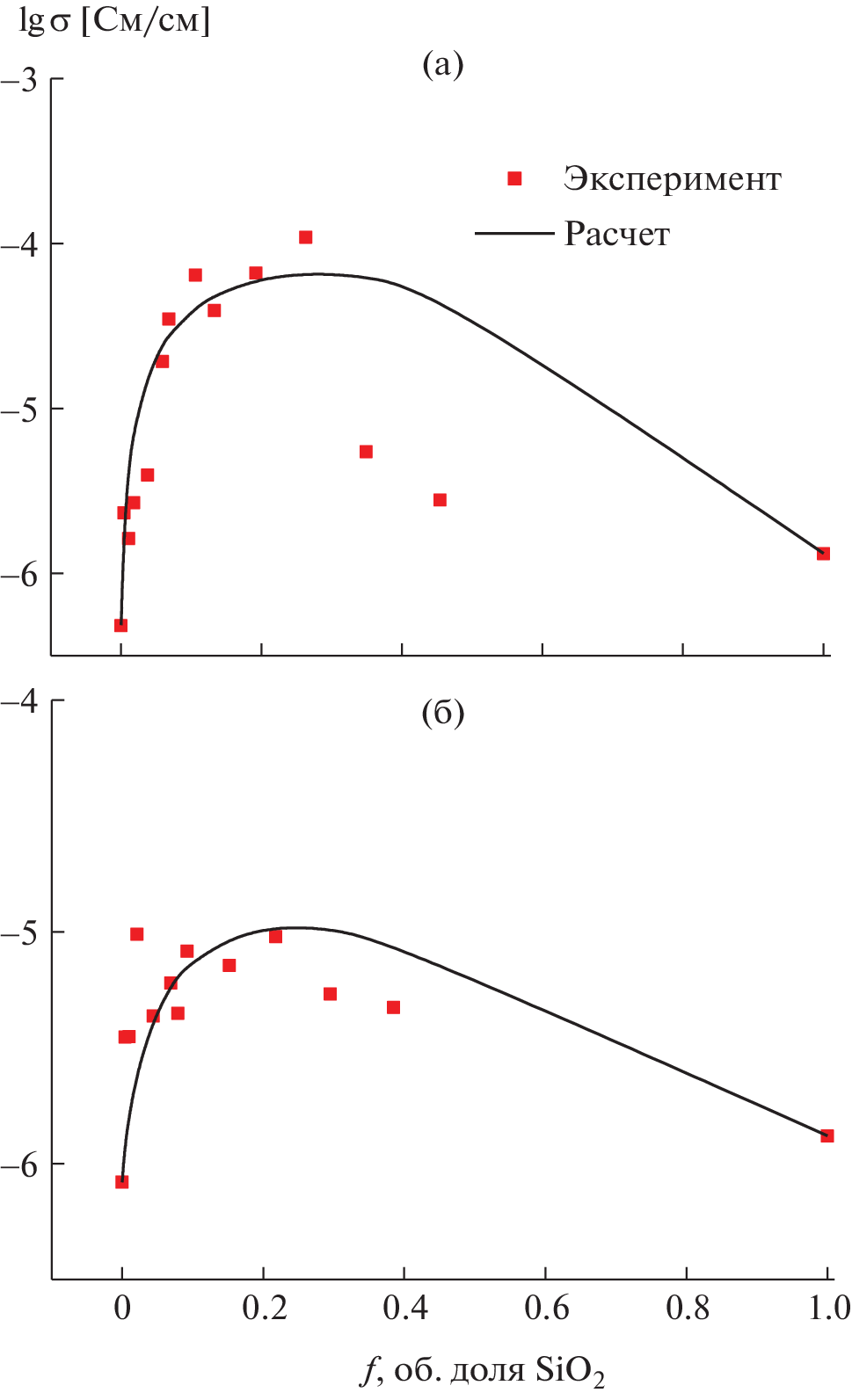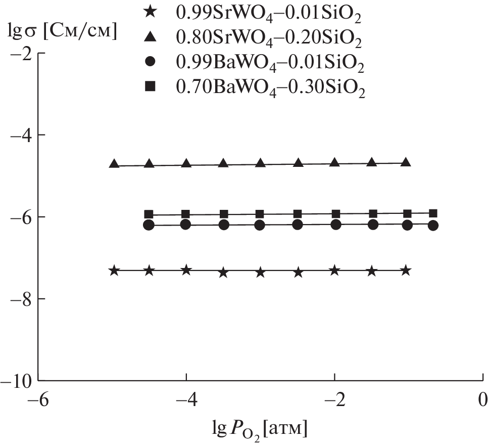 Composite materials (1-f)SrWO4–fSiO2 and (1–f)BaWO4–fSiO2, where f is the volume fraction of the dispersed SiO2 additive, were prepared by the solid-phase method. The resulting composites were studied by XPA, TG-DSC, SEM-EDA. The electrical conductivity of the composites was measured by the electrochemical impedance method as a function of temperature, oxygen partial pressure in the gas phase, and composition. To estimate the contribution of ionic conductivity, the sum of ionic transfer numbers was measured by the EMF method. It has been shown that the addition of 20–25 vol % nano-SiO2 to low-conductivity oxygen-ion conductors SrWO4 and BaWO4 leads to an increase in the ionic conductivity of composites based on them by two orders of magnitude and by 12 times, respectively. The increase in conductivity in the systems under study is explained by the additional contribution of interfacial boundaries formed between the MeWO4 matrix and dispersoid nanoparticles. The mixing rule [1] was used to calculate the electrical conductivity of (1-f)SrWO4–fSiO2 and (1-f)BaWO4–fSiO2 composites depending on the SiO2 content. The calculated concentration dependences of the conductivity obtained are in satisfactory agreement with the experimental results.