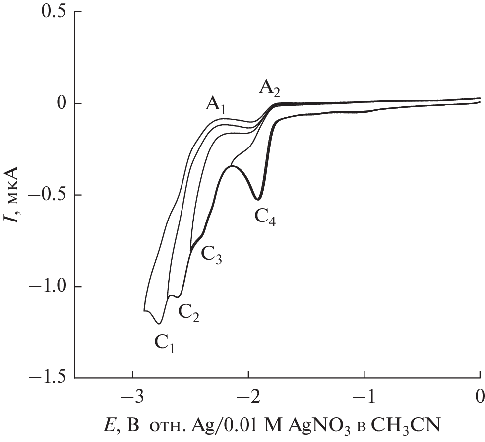 The electrochemical behavior of tetra-4-[4-(2,4,5-trichlorophenoxy)]phthalocyaninates of cobalt(II) (CoPc) and copper(II) (CuPc) in N,N-dimethylformamide 0.1 M nBu4NBF4 was studied by cyclic voltammetry. It has been experimentally established that both metal complexes are capable of irreversible reduction. In the reverse part of the CV curve for CoPc, an oxidation peak is observed, which is absent during anodic scanning, and corresponds to the cathodic reaction product. The metal complexes themselves do not oxidize under the conditions.