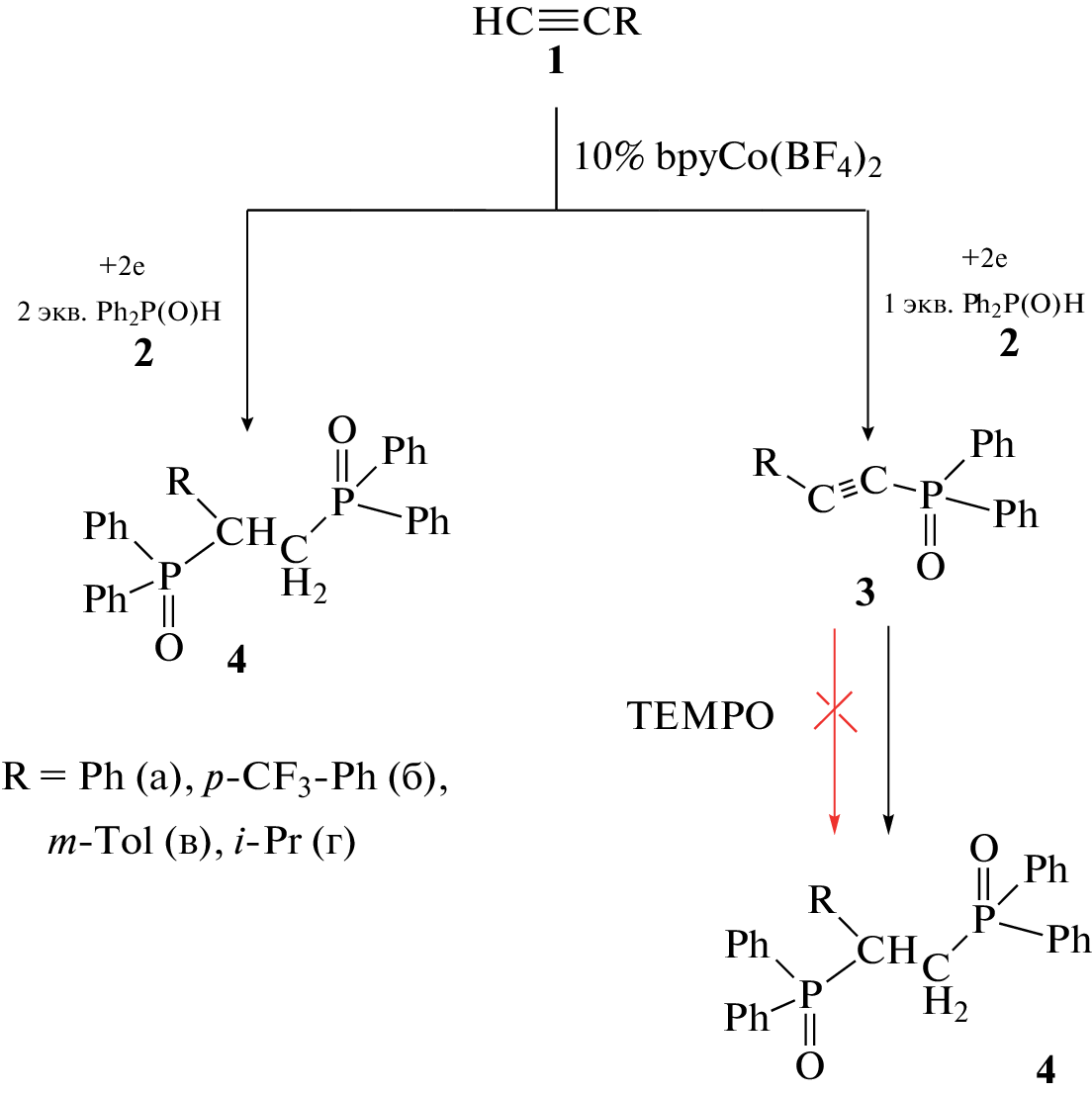 Electrocatalytic phosphorylation of terminal acetylenes with diarylphosphine oxides in the presence of a bpyCo(BF4)2 catalyst was first implemented under electro-reducing conditions with yields up to 75%. The nature of the solvent and the background electrolyte, the presence of oxygen and water determine the formation of certain products of phosphorylation of acetylenes. The variation of the above factors was carried out in order to select optimal conditions for electrosynthesis to achieve stereo and chemoselectivity. Voltammetric studies were used to establish the redox properties of participants to optimize processes involving a cobalt catalyst.